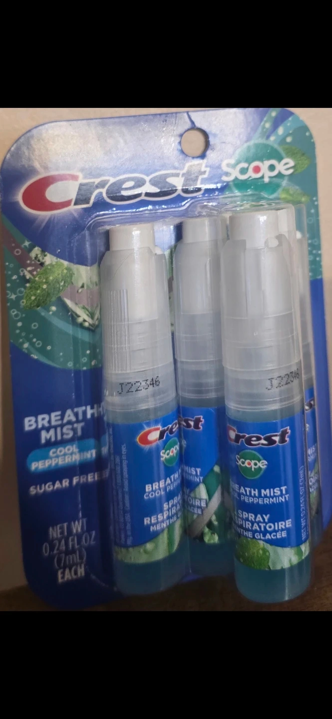 Selling a pack of Crest Scope Breath Mist in Cool Peppermint flavor! It's sugar-free and contains 0.24 fl oz (7ml) each