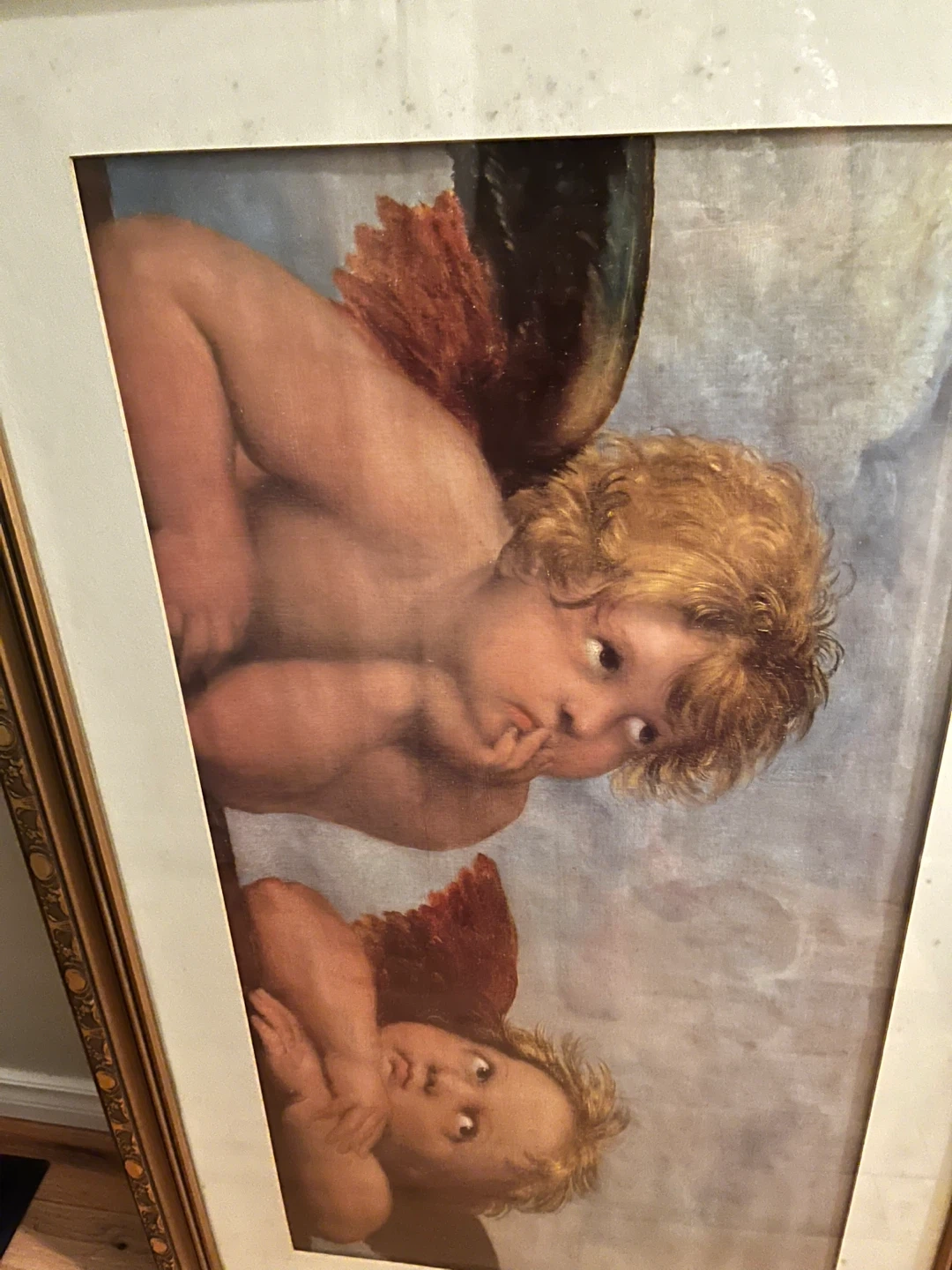 A lovely framed print featuring cherubs. The frame has an ornate gold finish. The print measures 45 inches by 28.5 inches, the frame it’s in great condition and the picture inside, the white layer has to be replaced