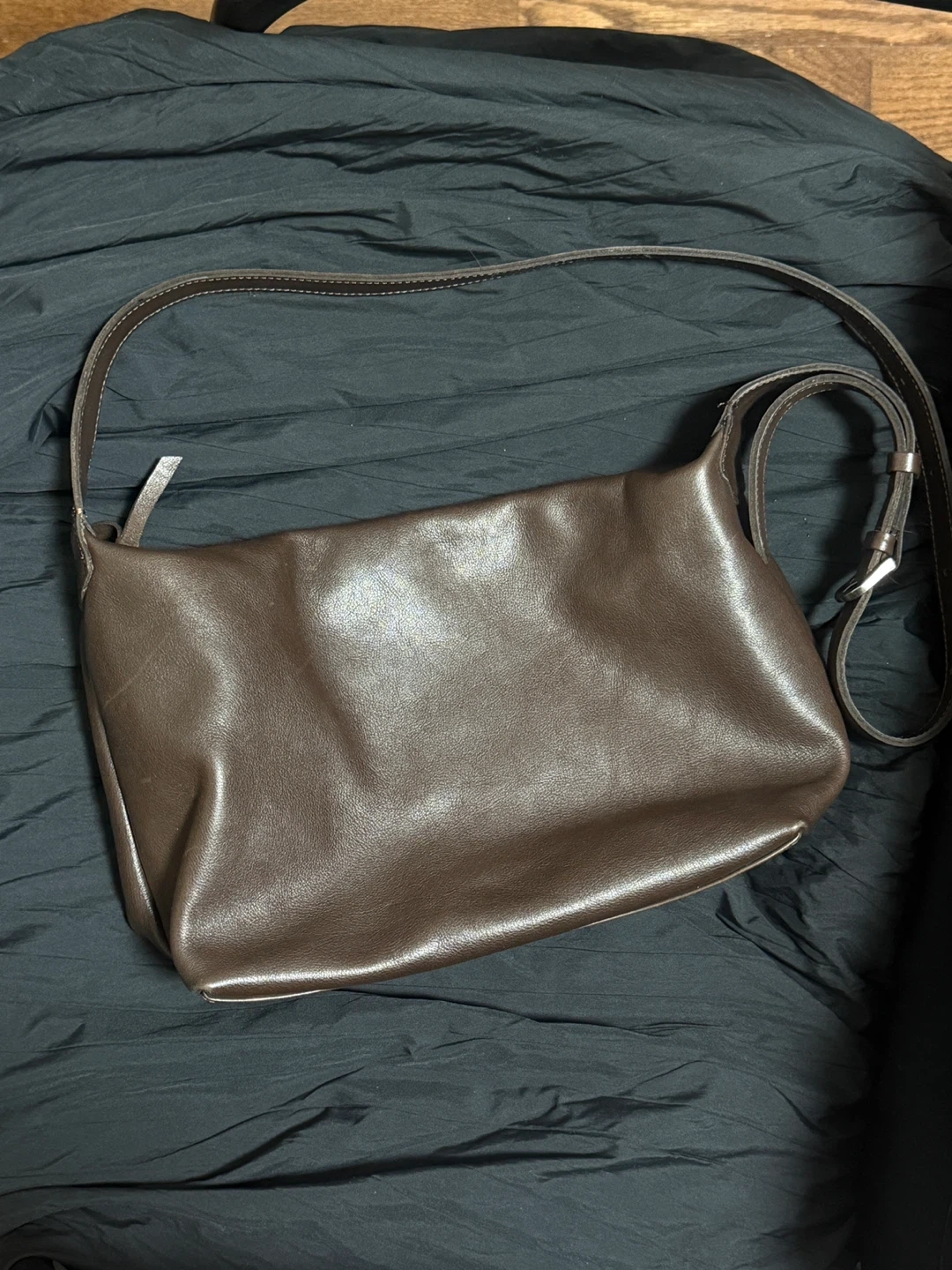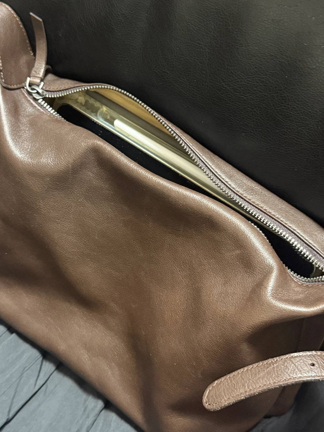 This is a stylish brown leather shoulder bag. It features a zippered main compartment and an adjustable strap. can fit iPad air!