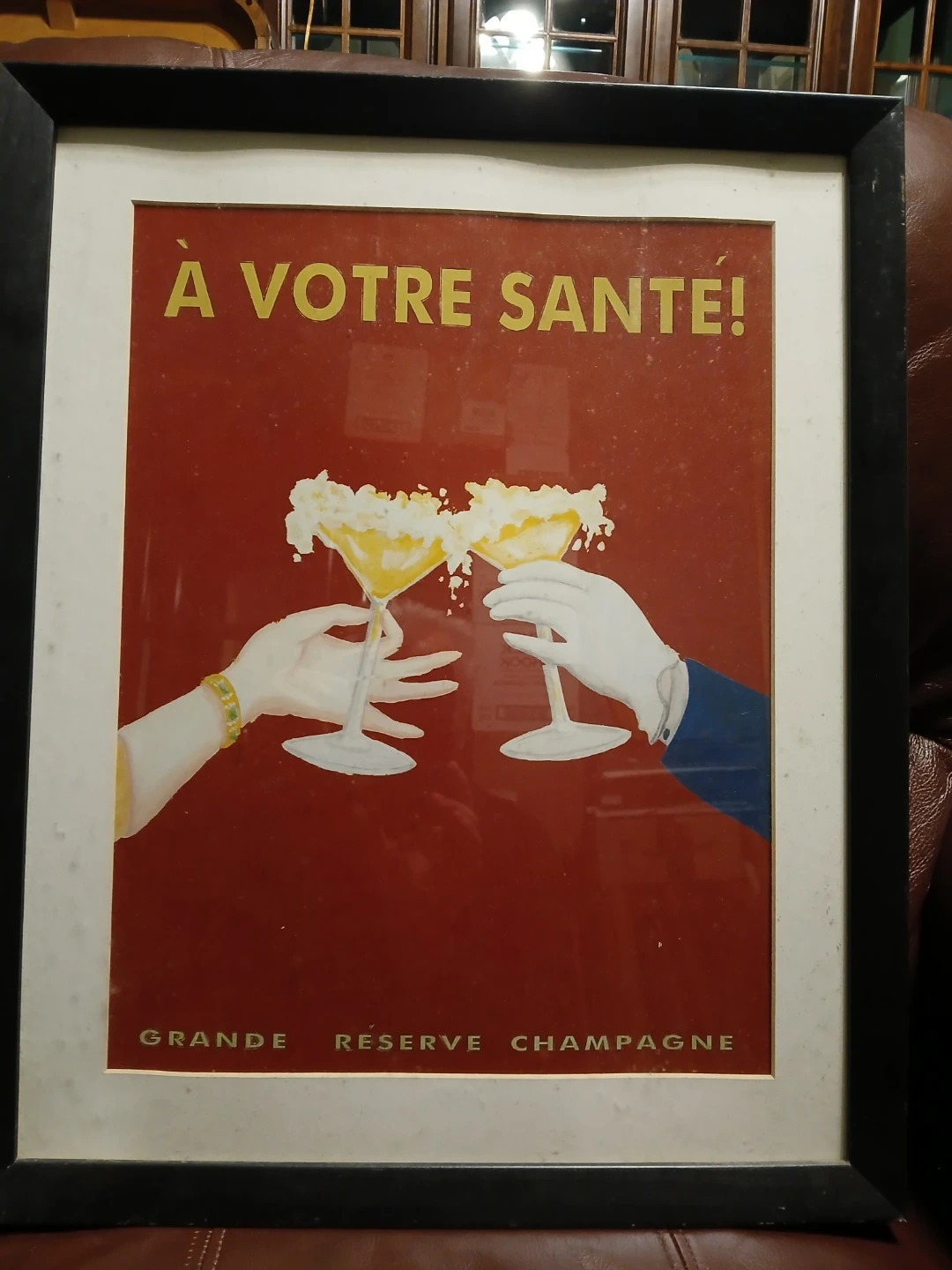 This piece features the iconic "A Votre Sante"! (To Your Health)! Style: Vintage French Lithograph Reproduction.