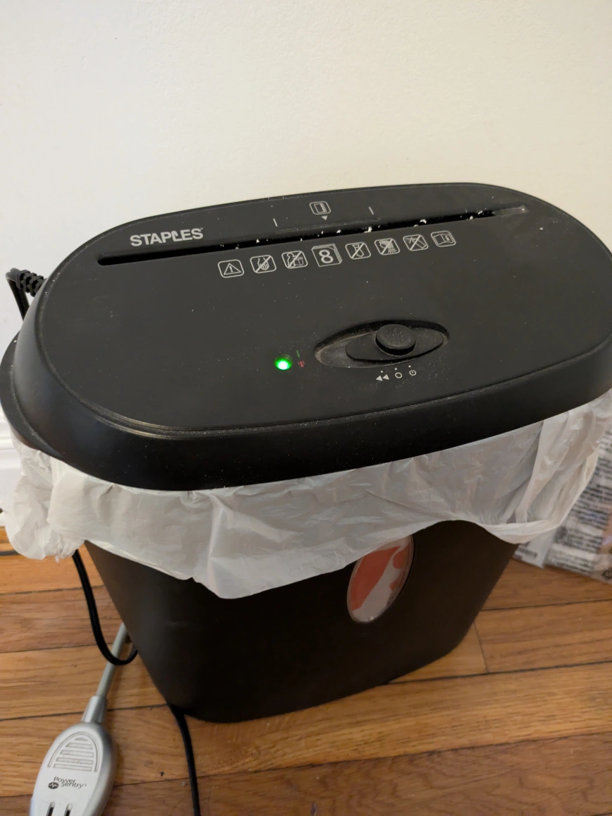 Black paper shredder. Diamond cut shredding and card shredding slot eg credit cards. Shreds up to 8 sheets at a time. Includes a removable bin and reverse function