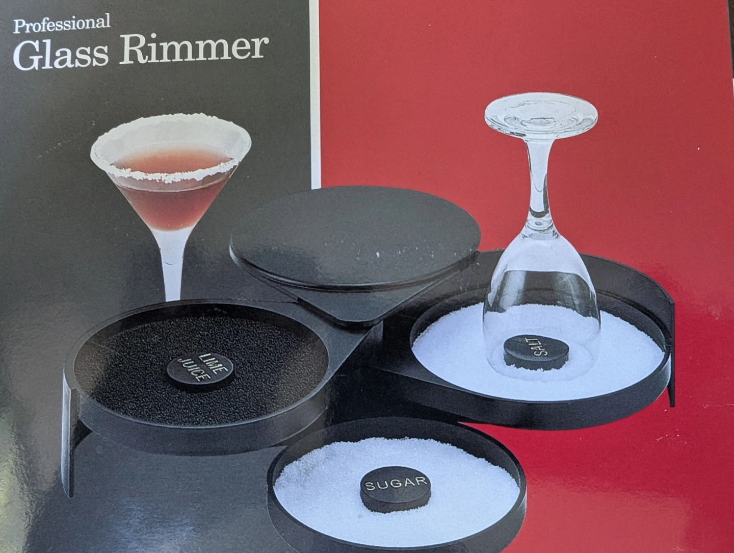 Three-compartment glass rimmer. Holds salt, sugar, and lime juice. Includes a small, circular platform for the glass. Black plastic construction.