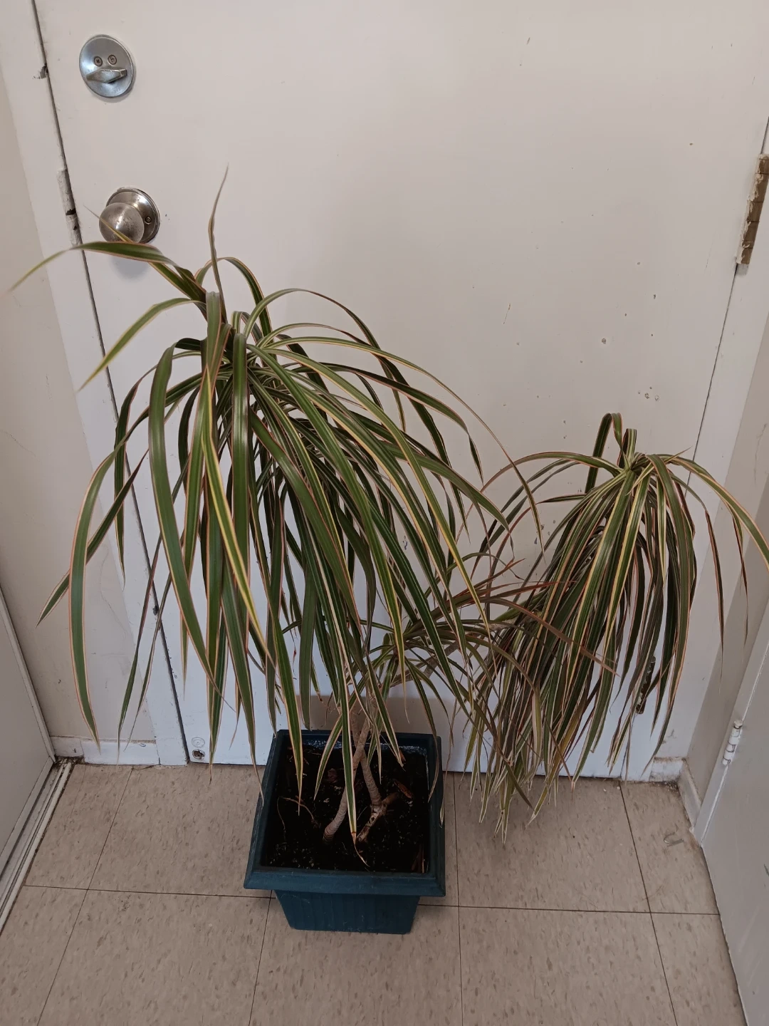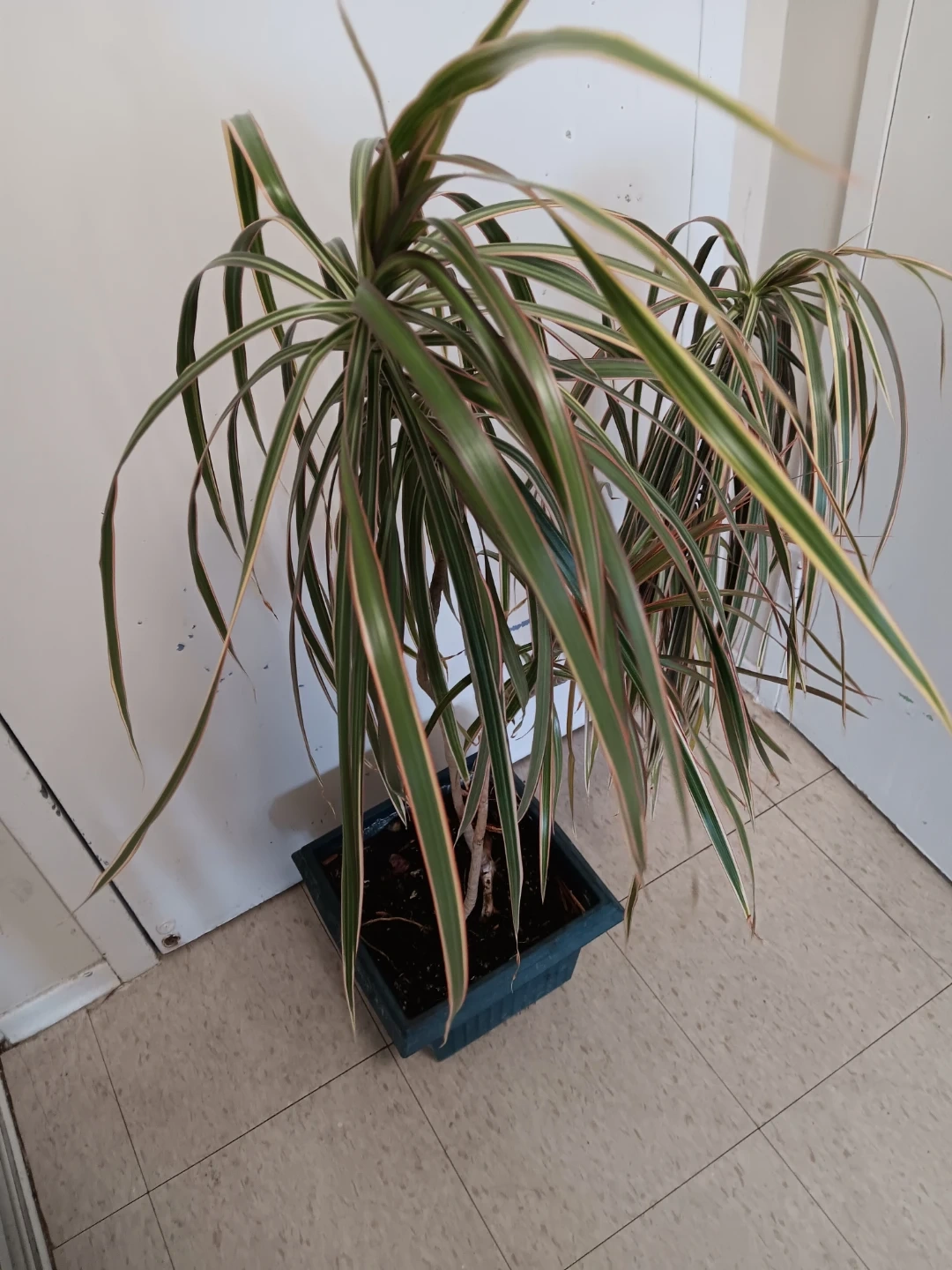 Healthy Dracaena Fragrans plant in a dark green square pot. Features long, arching leaves with green and yellow striping and red edges. This plant adds a nice touch of greenery to any indoor space. Approximately 3 feet.