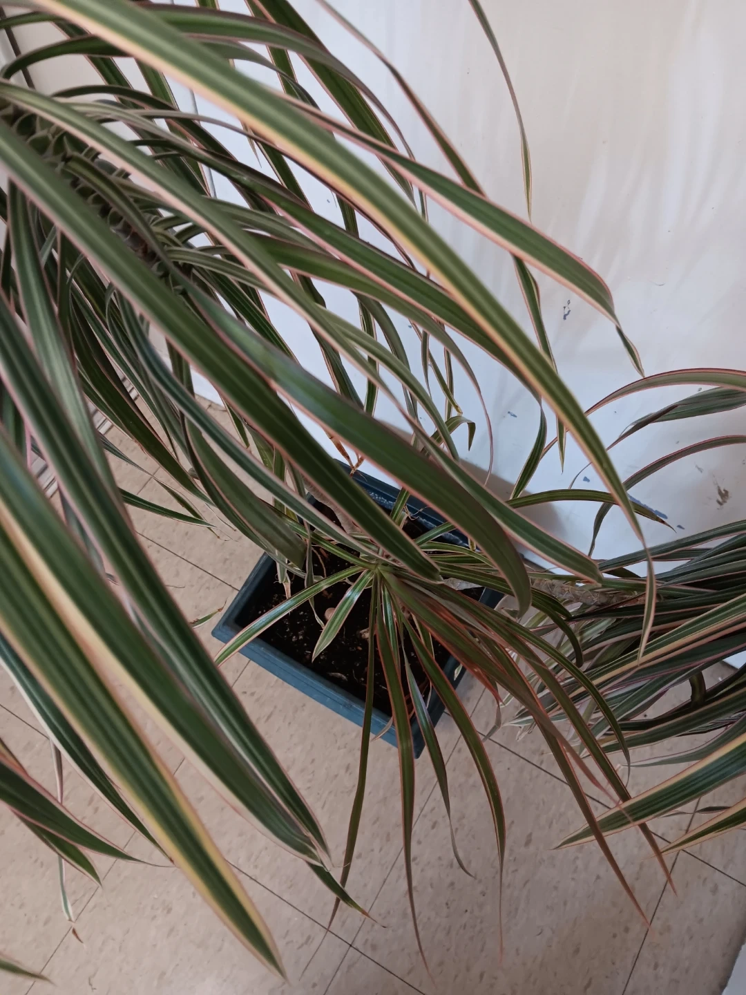 Healthy Dracaena Fragrans plant in a dark green square pot. Features long, arching leaves with green and yellow striping and red edges. This plant adds a nice touch of greenery to any indoor space. Approximately 3 feet.