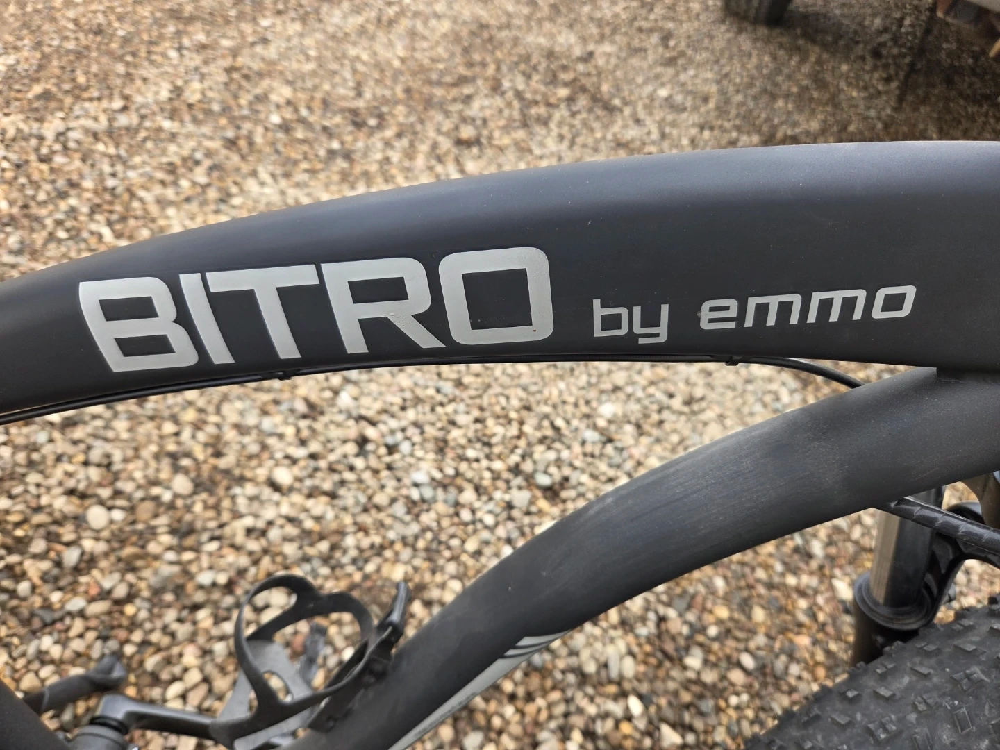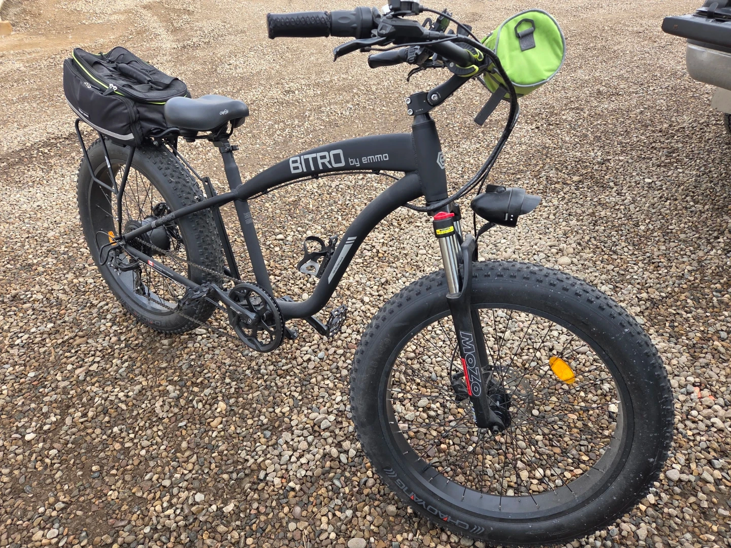 This black BITRO by EMMO electric bike has fat tires for all-terrain riding. It comes with a rear rack and a helmet. This is a large bike for big and tall people i only wrote it about ten times.The bike includes a battery and charger.and hydraulic brakes and soft spring seat for comfort. And cellphone holder on the handbars plus Comes with to secret locks one connects to disk break. And one is for frame, wheel extremely loud ear Piercing alarmgreat for cruising around town or hitting trails ! It doesn't come with the leather bags and the pitchers.But it does come with leather bags that are shown black and green