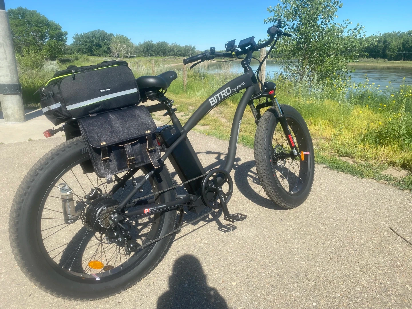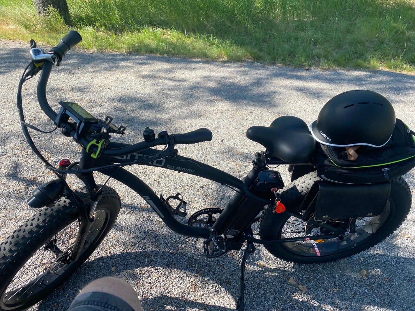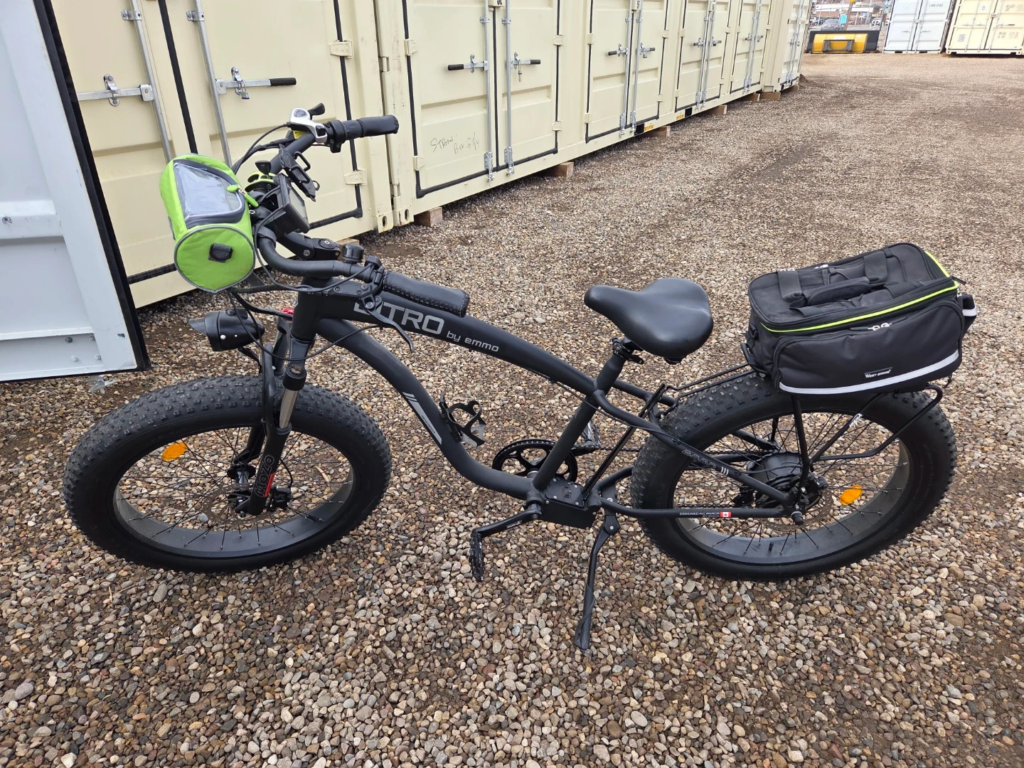 This black BITRO by EMMO electric bike has fat tires for all-terrain riding. It comes with a rear rack and a helmet. This is a large bike for big and tall people i only wrote it about ten times.The bike includes a battery and charger.and hydraulic brakes and soft spring seat for comfort. And cellphone holder on the handbars plus Comes with to secret locks one connects to disk break. And one is for frame, wheel extremely loud ear Piercing alarmgreat for cruising around town or hitting trails ! It doesn't come with the leather bags and the pitchers.But it does come with leather bags that are shown black and green