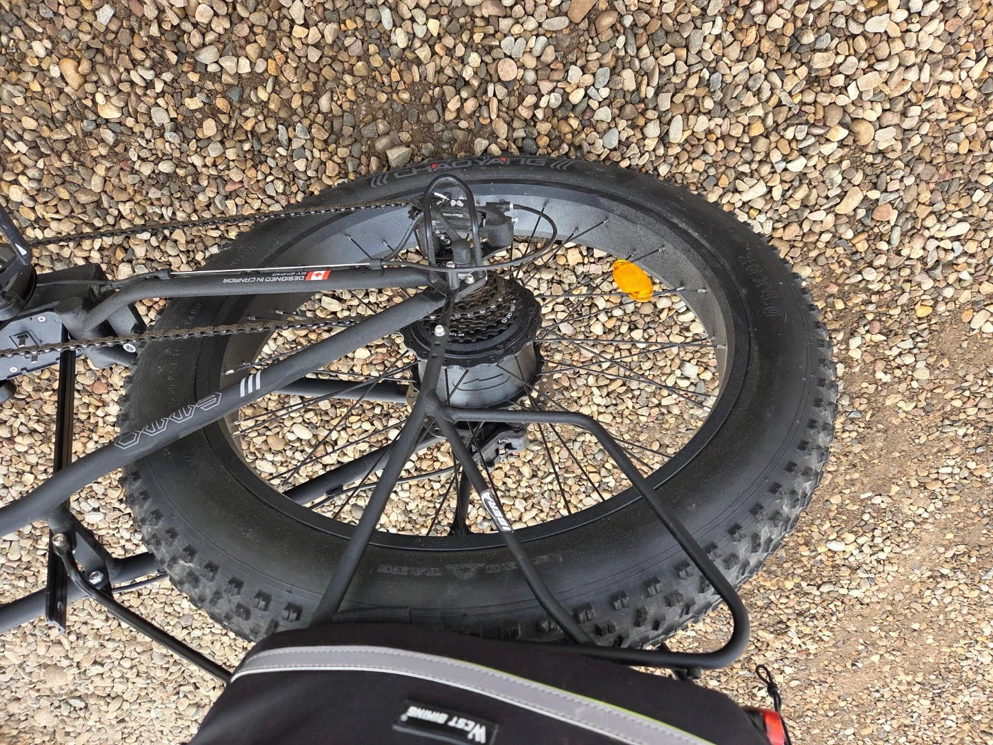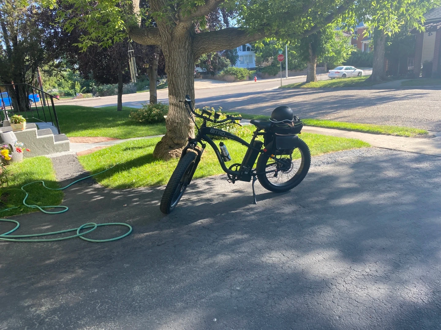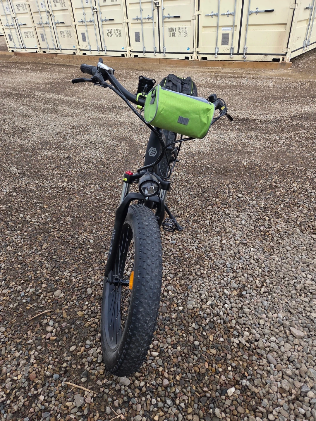 This black BITRO by EMMO electric bike has fat tires for all-terrain riding. It comes with a rear rack and a helmet. This is a large bike for big and tall people i only wrote it about ten times.The bike includes a battery and charger.and hydraulic brakes and soft spring seat for comfort. And cellphone holder on the handbars plus Comes with to secret locks one connects to disk break. And one is for frame, wheel extremely loud ear Piercing alarmgreat for cruising around town or hitting trails ! It doesn't come with the leather bags and the pitchers.But it does come with leather bags that are shown black and green