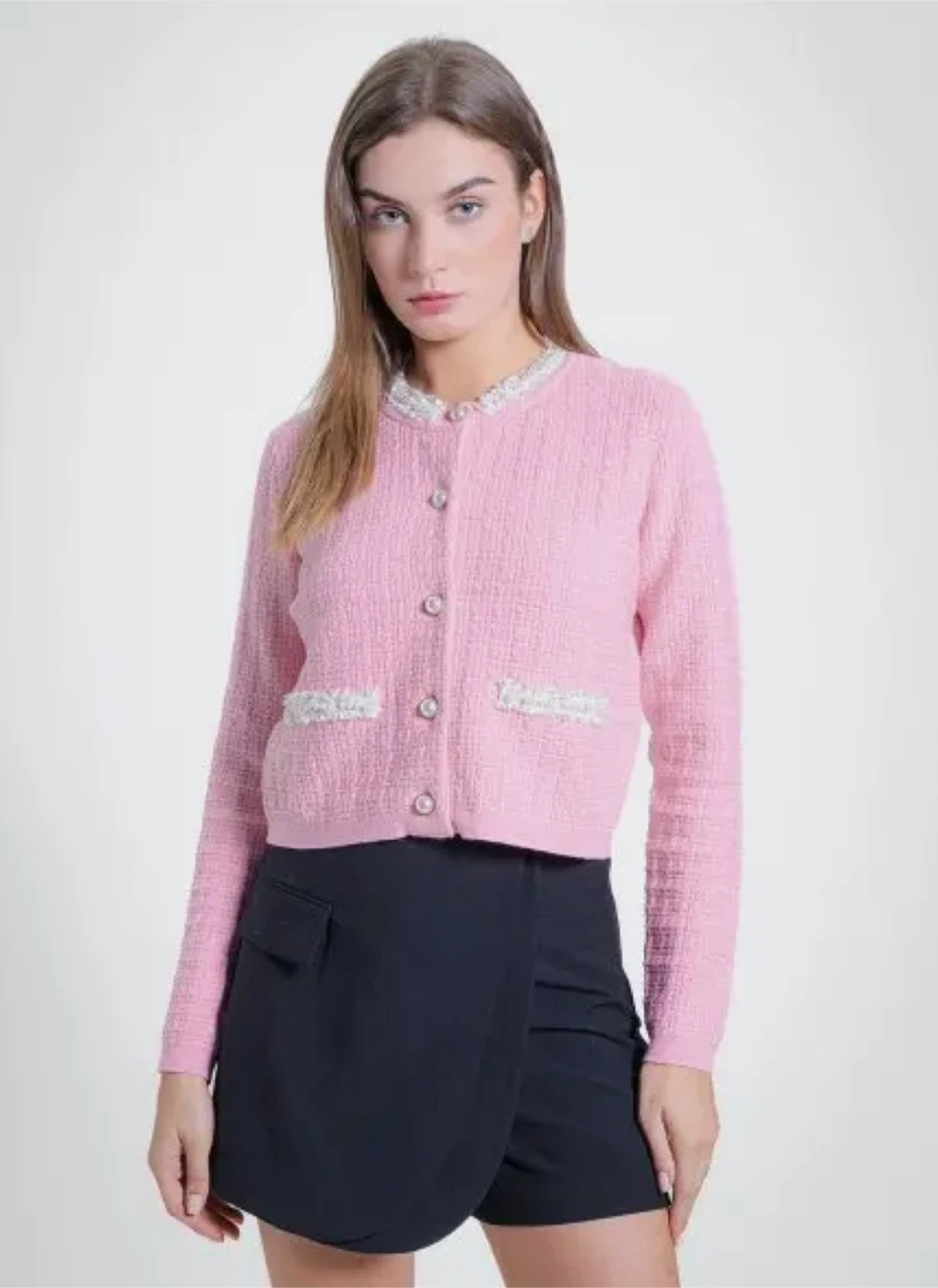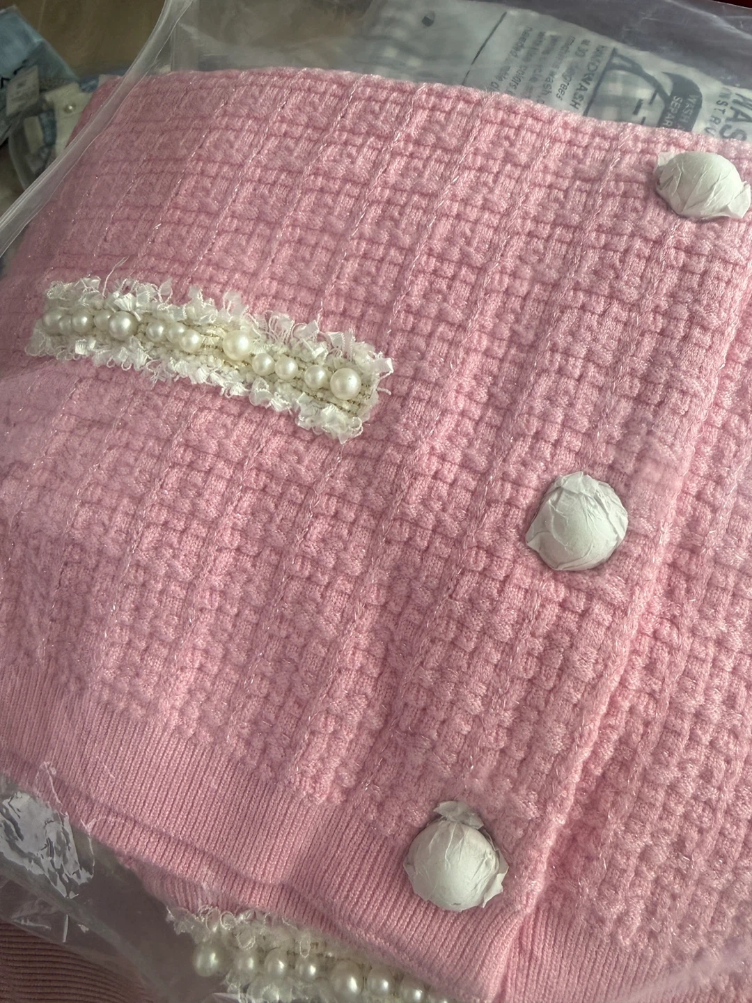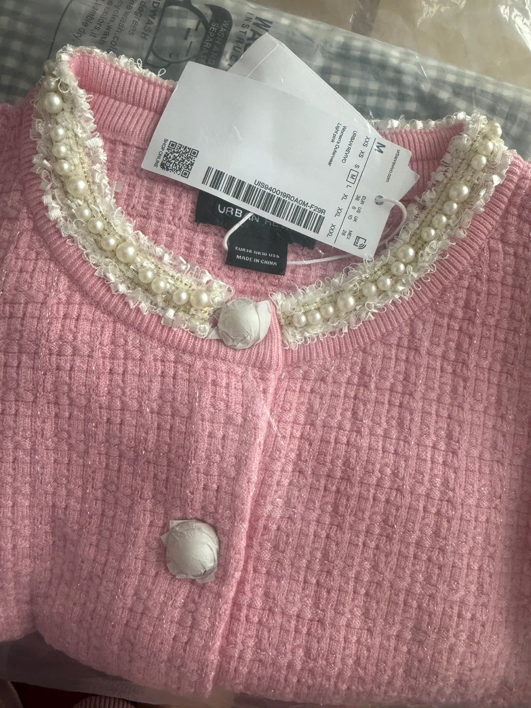 This is a brand Urban Revivo pink cardigan with pearl detailing! It's a size medium and still has the tags on. Perfect for adding a touch of elegance to any outfit!