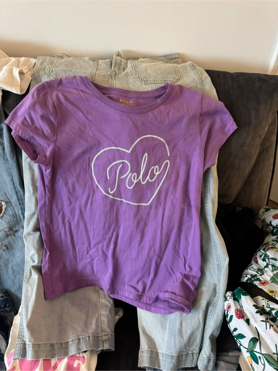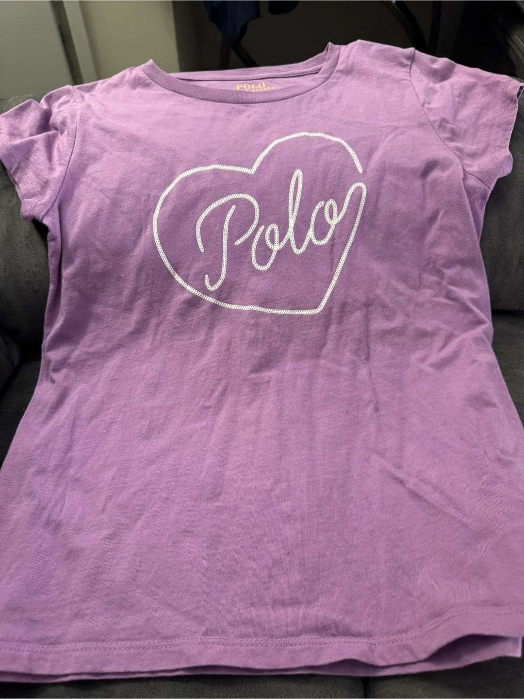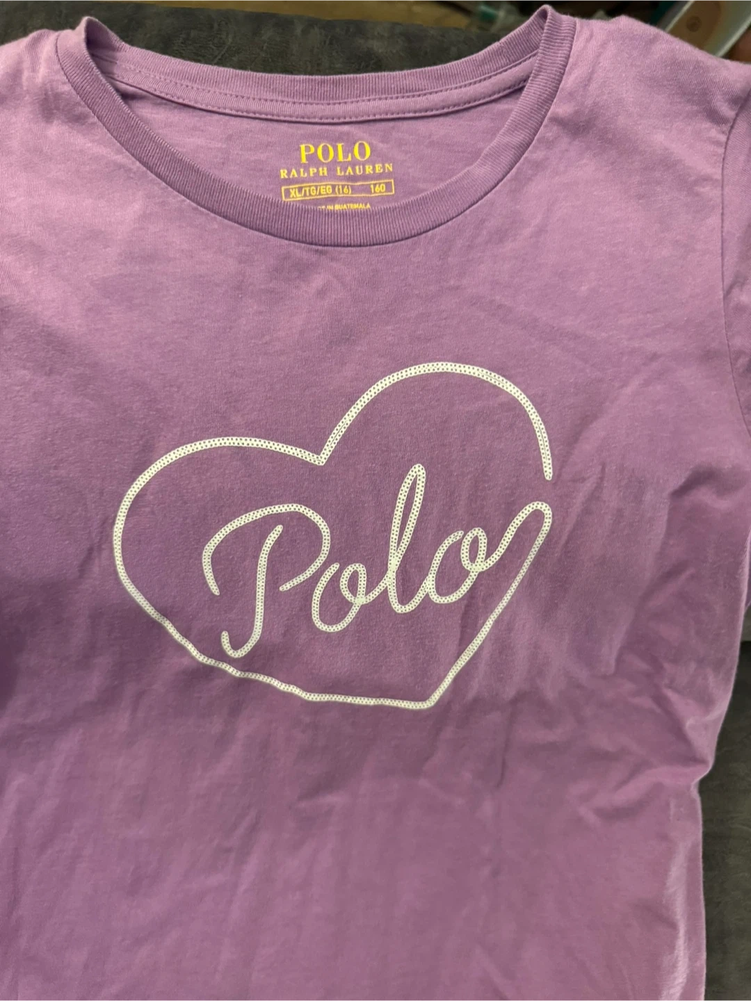 This is a purple Polo Ralph Lauren t-shirt with a white heart and 'Polo' graphic. It's a size XL/TG/EC (16) and made in Guatemala. A comfortable tee for everyday wear!