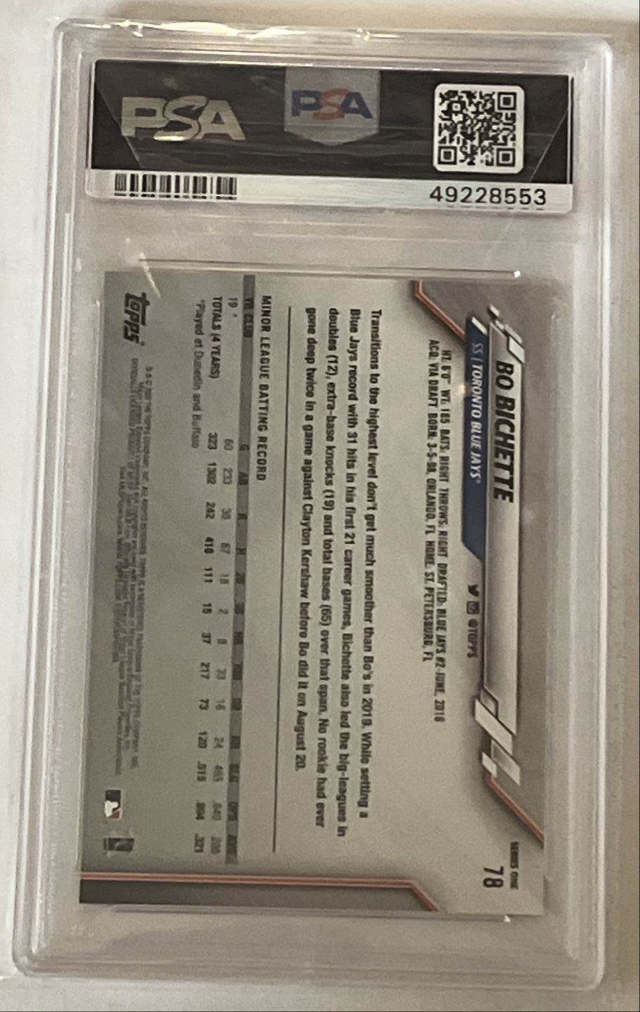 1 / 21 / 2Buy & Sell2020 Topps Bo Bichette #78 Rookie Card PSA 92020 Topps Bo Bichette #78 Rookie Card PSA 9$20Graded PSA 9. Mint condition. Bo Bichette rookie card. Toronto Blue Jays baseball card. Willing to trade. Check my other listingsConditionLike newWHERE TO MEETStockyards MallView MapSELLERverifiedMarcus LCorso Italia19112 reviews0 chats·1 favorites·47 viewsSEND CHAT TO SELLERHi Marcus L! I’m interested in your listing.Hi Marcus L! I’m interested in your listing.Get the Karrot app to chatSign In to chat