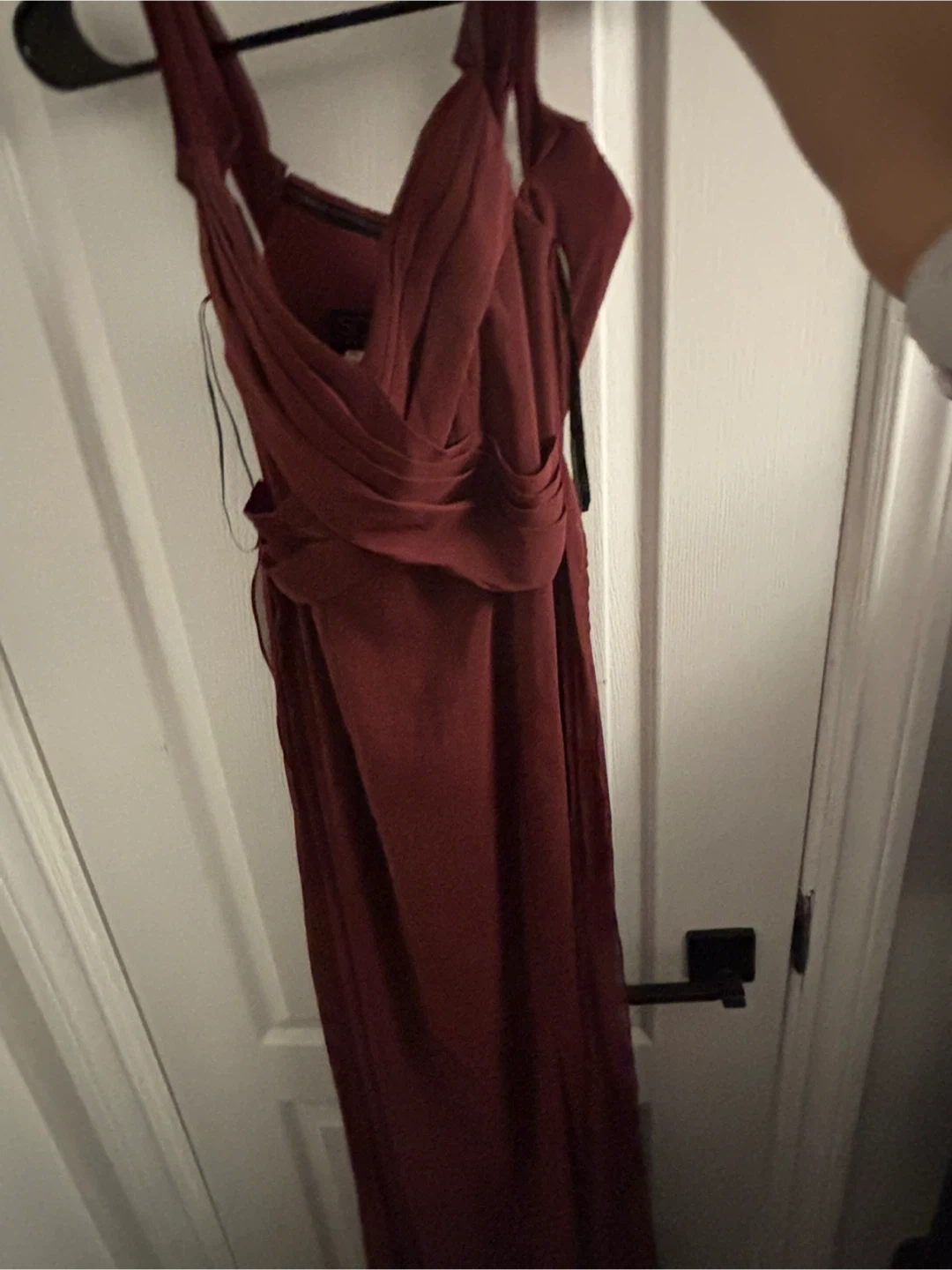 Selling a beautiful burgundy maxi dress. It's in great condition and would be perfect for a special occasion or evening out. The dress has a flattering silhouette and a lovely drape.