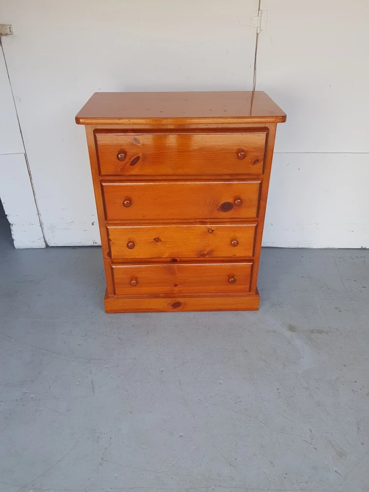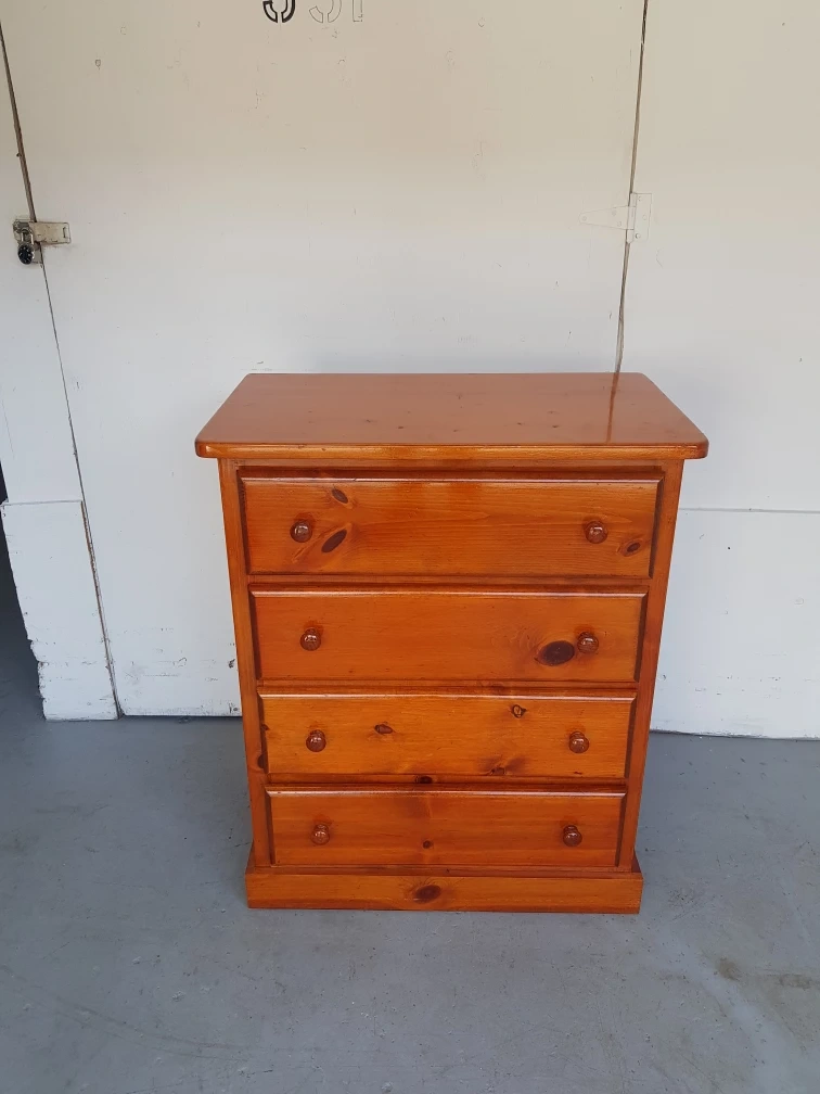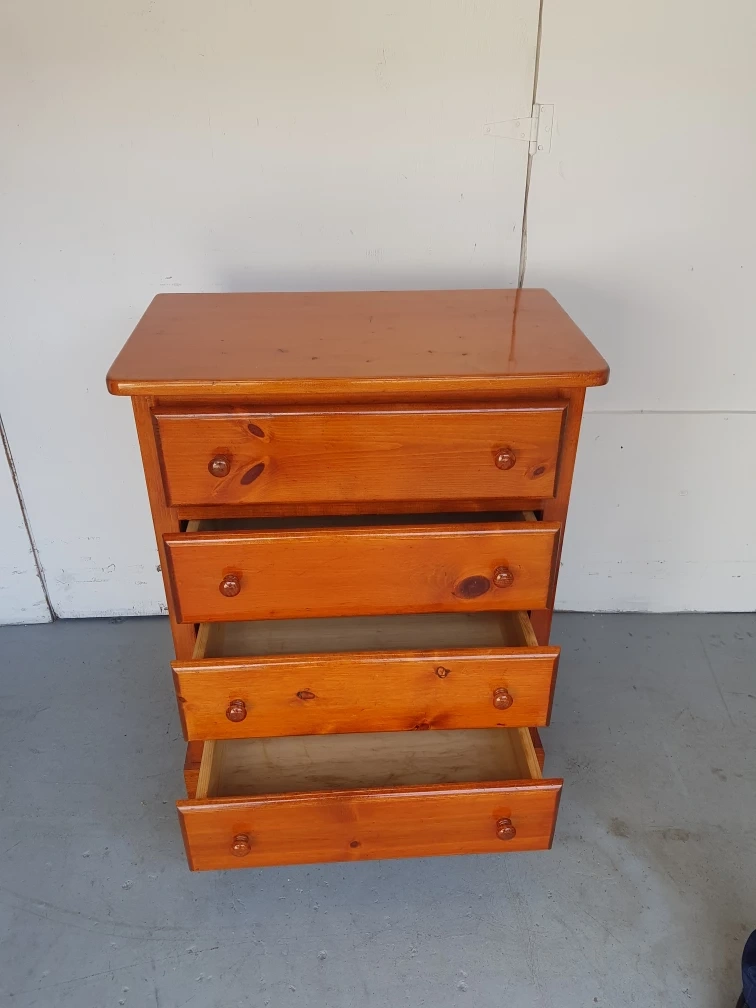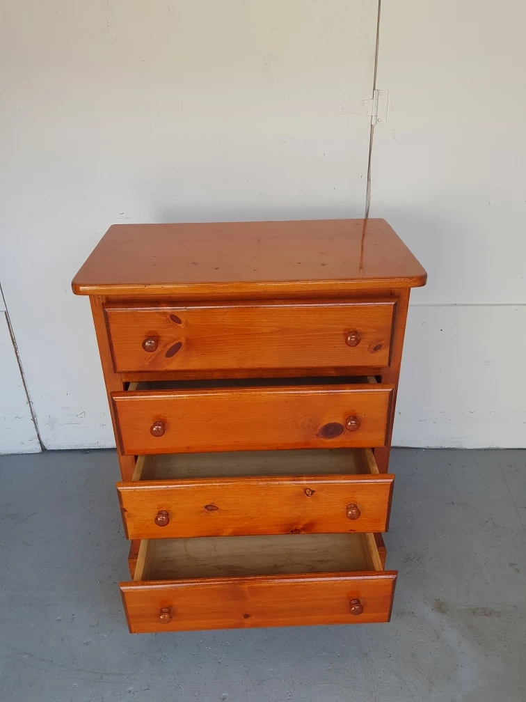 Solid wooden dresser with four drawers. Features wooden knobs. A beautiful piece of furniture to help you organize your belongings and create a sense of peace.