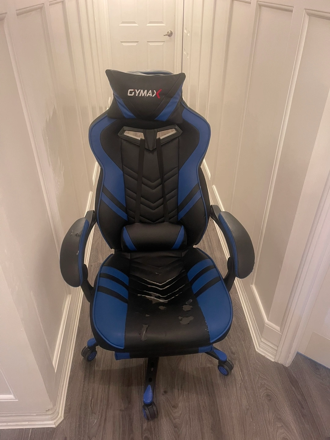 Selling a GYMAX gaming chair in blue and black. Please note there are some signs of wear on the seat as shown in the pictures.