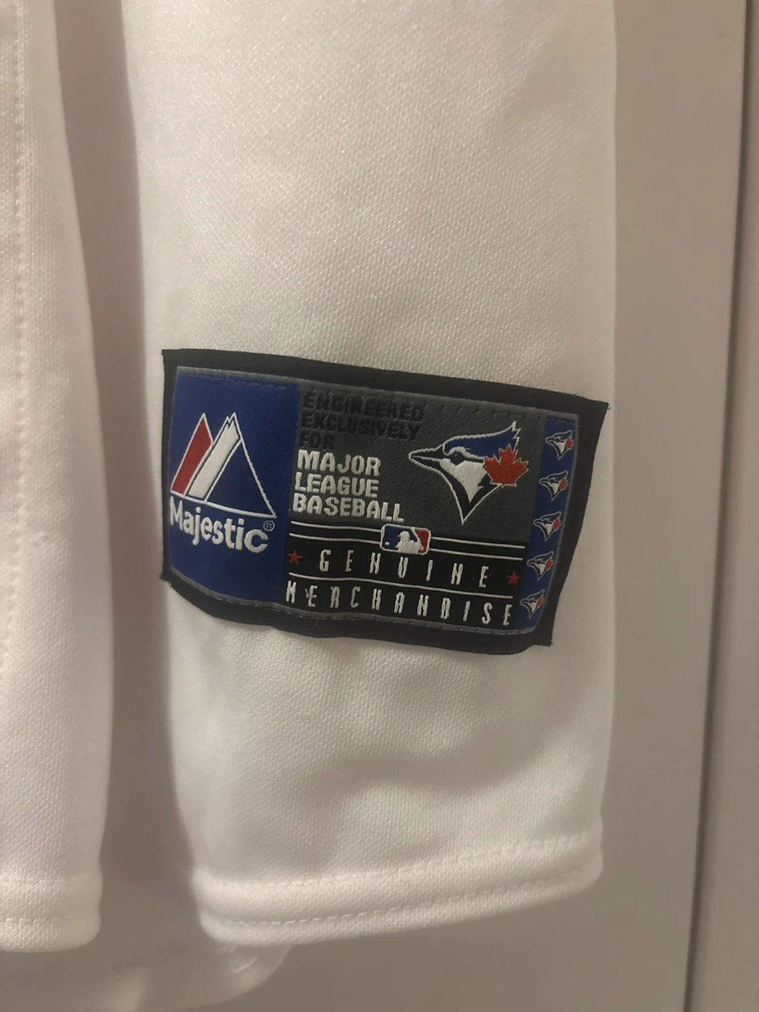White Majestic Toronto Blue Jays baseball jersey. Features embroidered "Blue Jays" text and team logo. This is genuine merchandise, engineered exclusively for Major League Baseball.