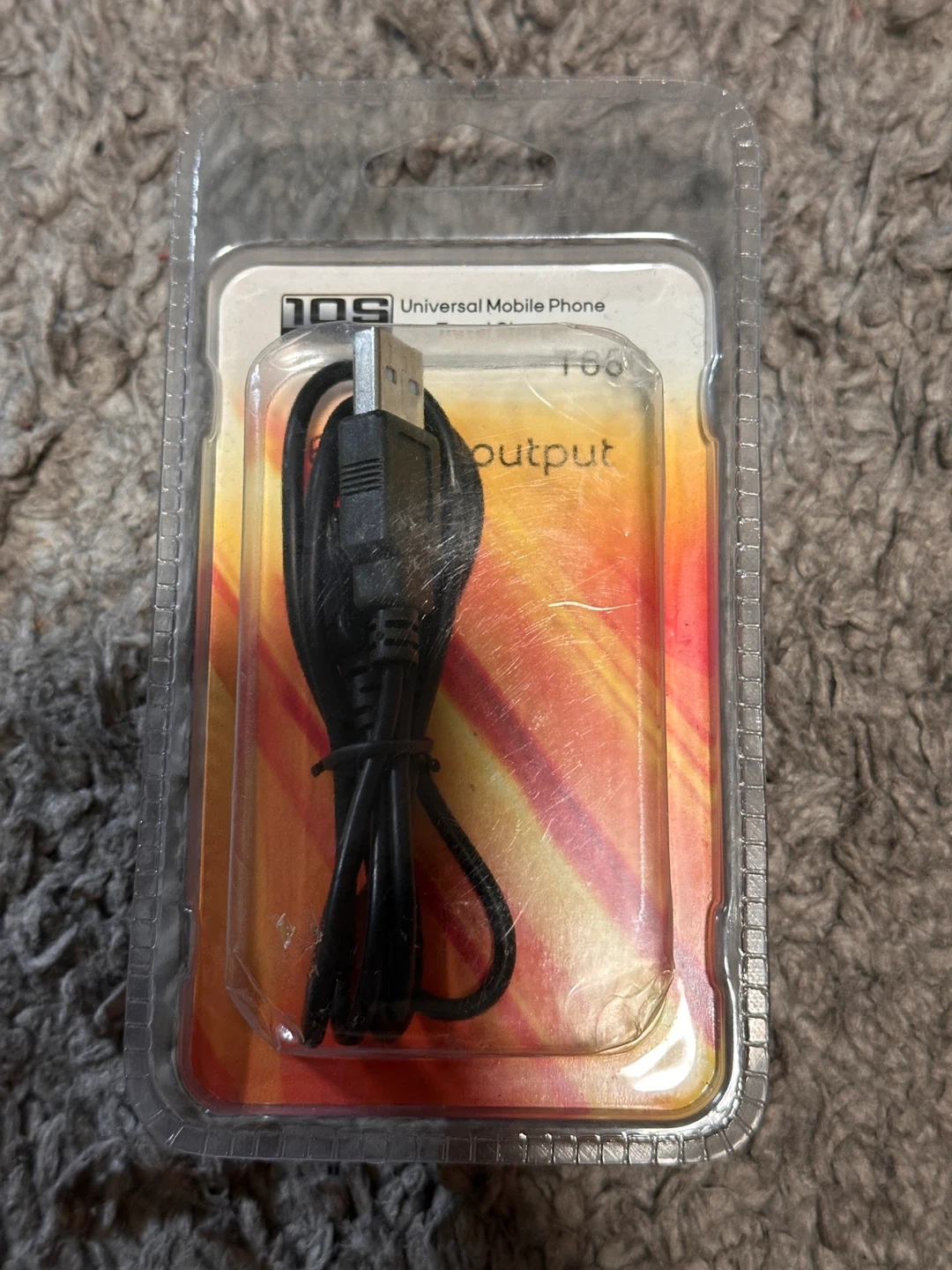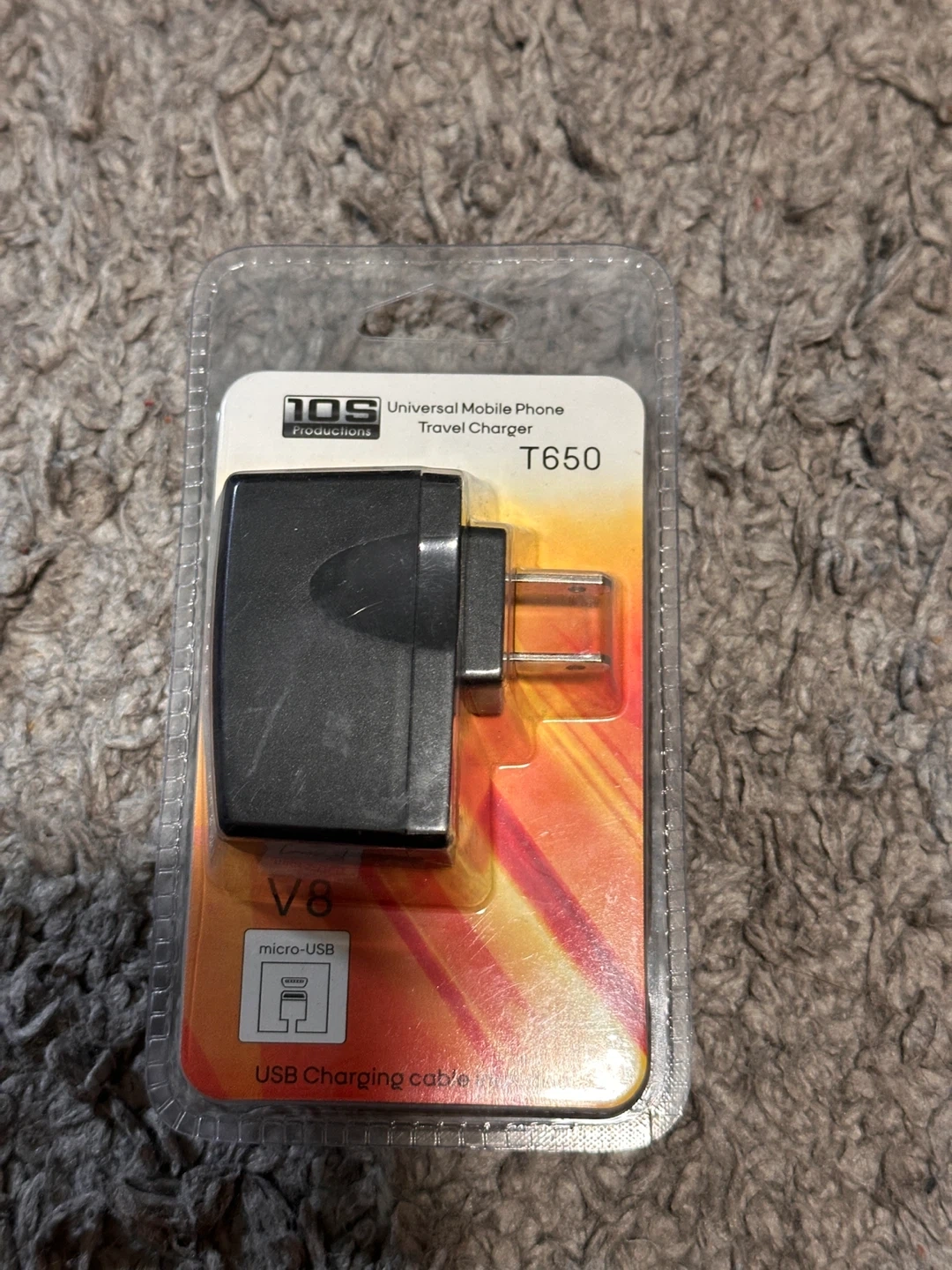 Selling a new IOS Universal Mobile Phone Travel Charger. Includes a USB charging cable and a micro-USB V8 charger. The model number is T650. Comes in the original packaging