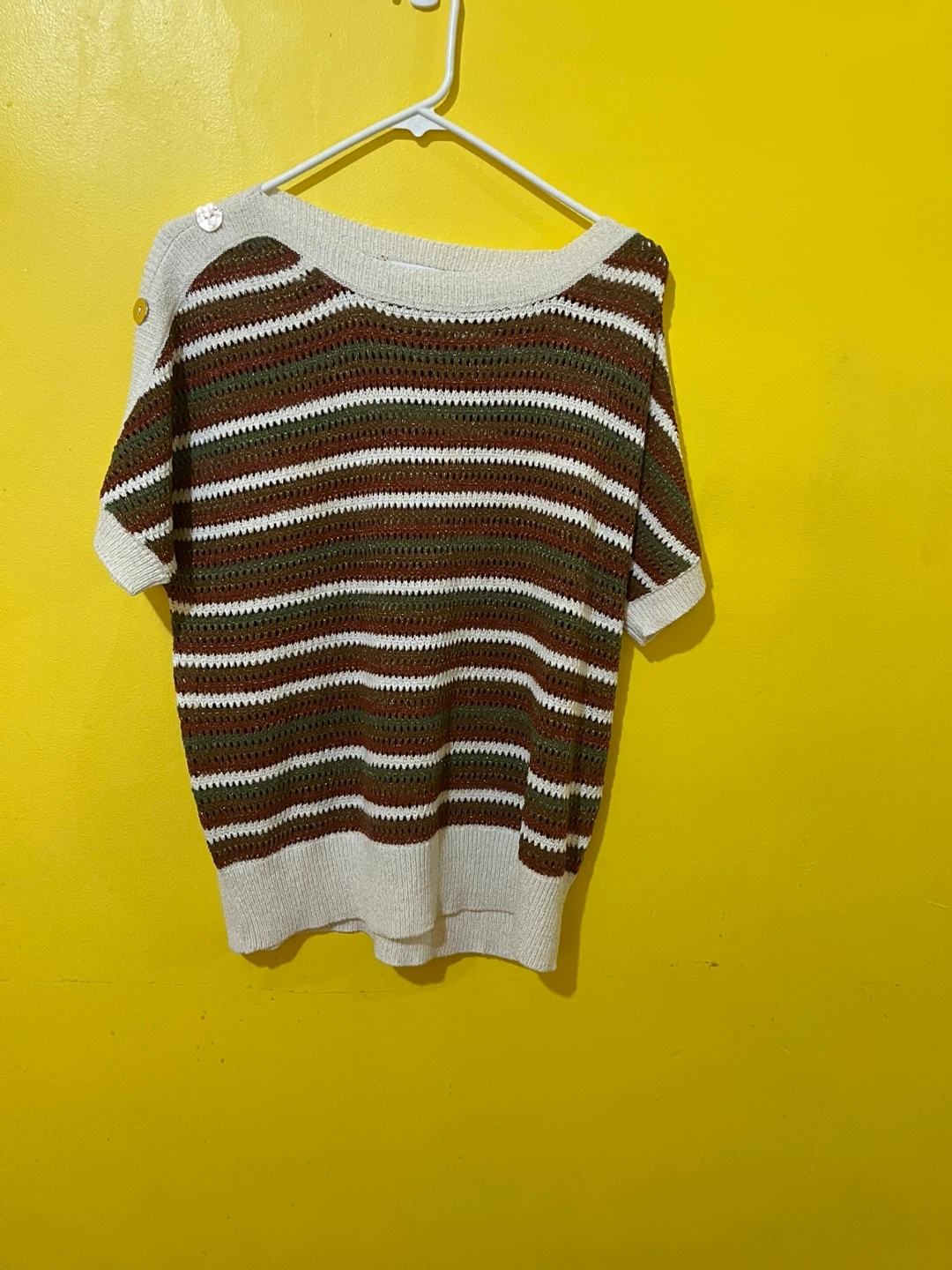 Short-sleeved sweater with a striped pattern in brown, green, and white. It has decorative buttons on one shoulder. Made of a lightweight, open-knit material.