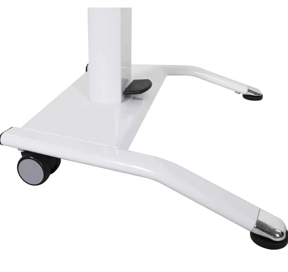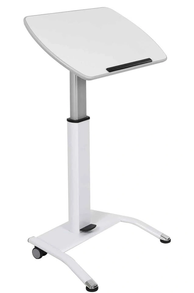 Pneumatic height-adjustable stand-up desk / lectern with tilting surface. Great for working from home, presentations, teaching, Zoom calls, or as a compact standing desk. Clean white finish.