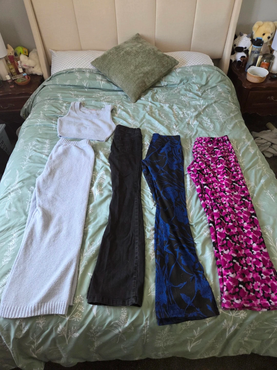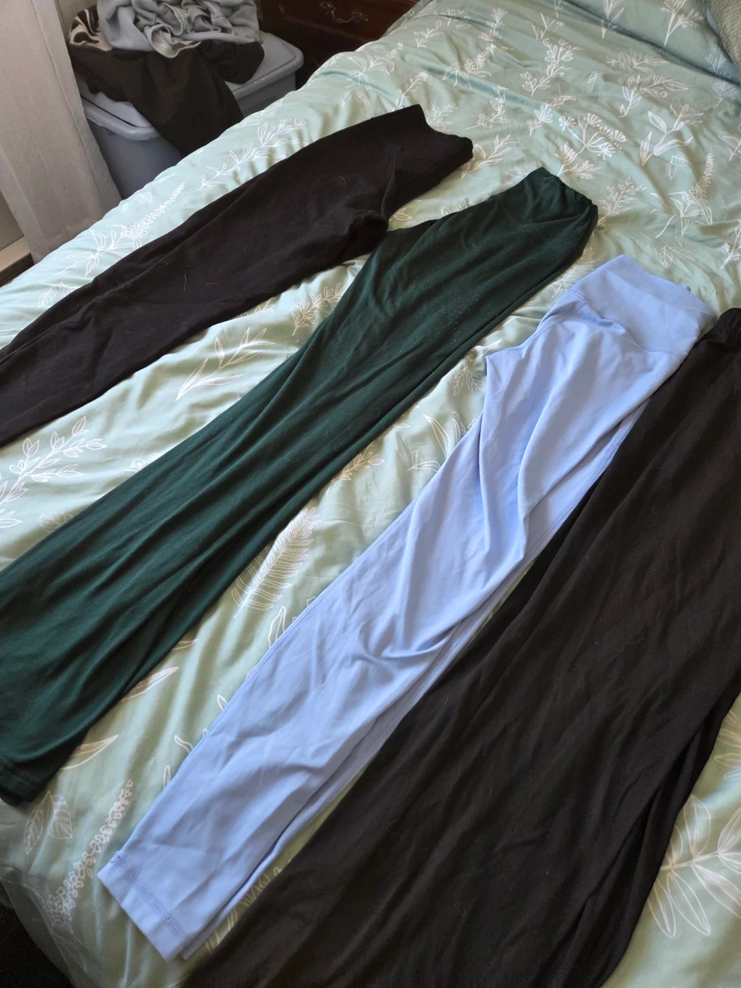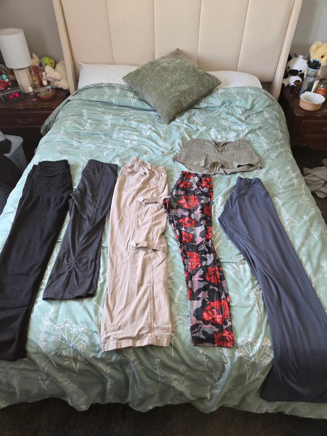 Bundle includes various athletic leggings, dress pants, shorts and lounge wear in different colours and patterns. Brands and sizes vary.