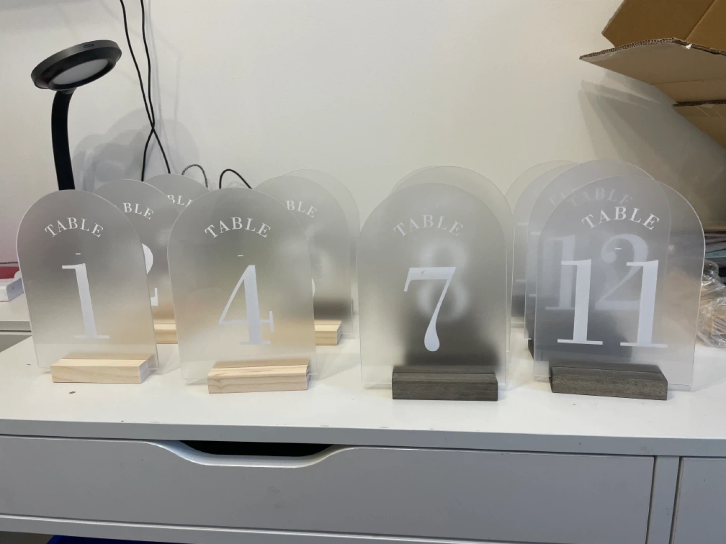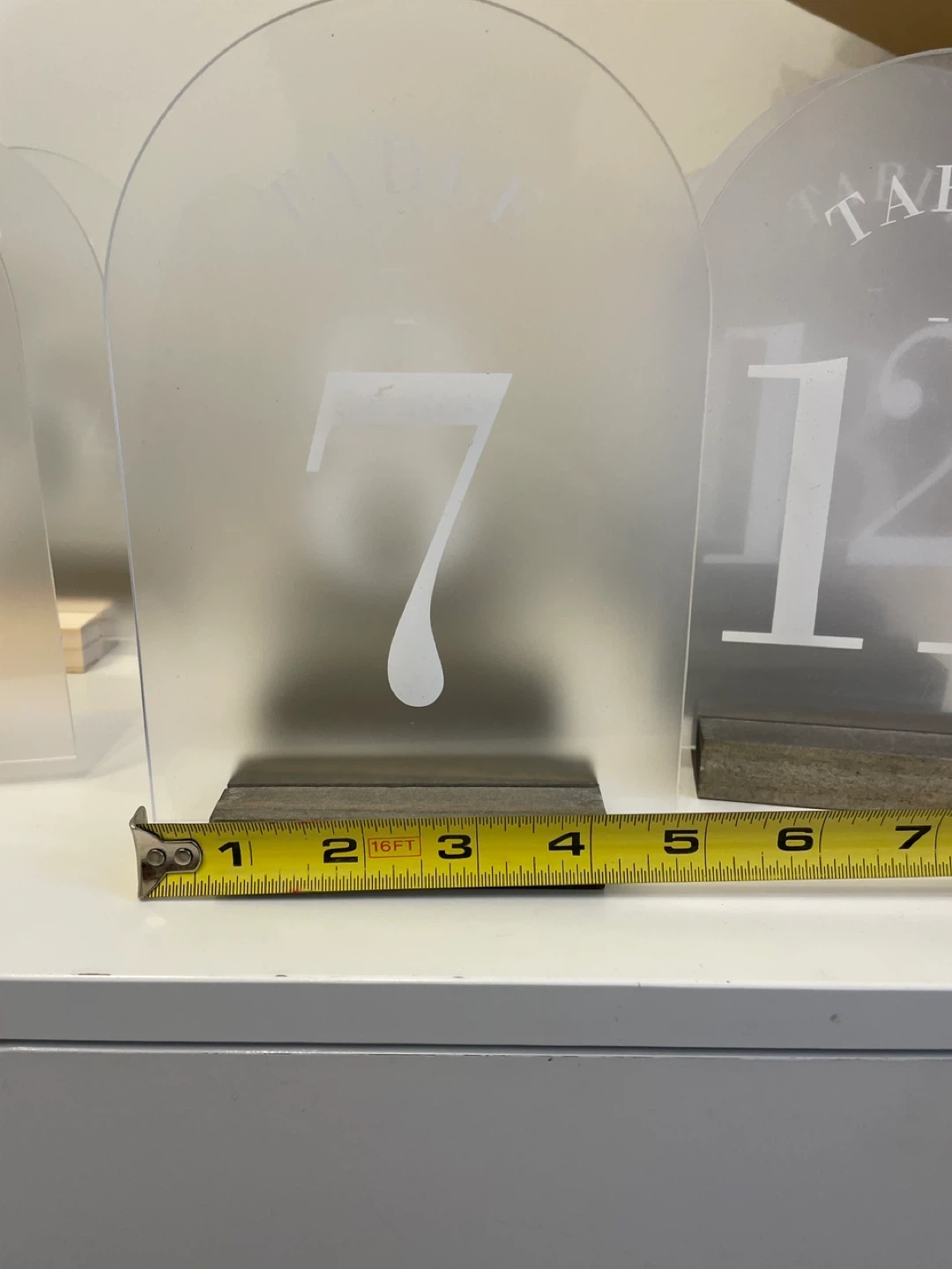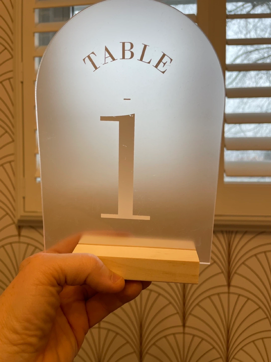 Frosted acrylic arch table numbers, perfect for weddings or events. Each number is 7 inches tall and comes with a wooden base. Includes numbers 1-14. They're a stylish way to guide guests!