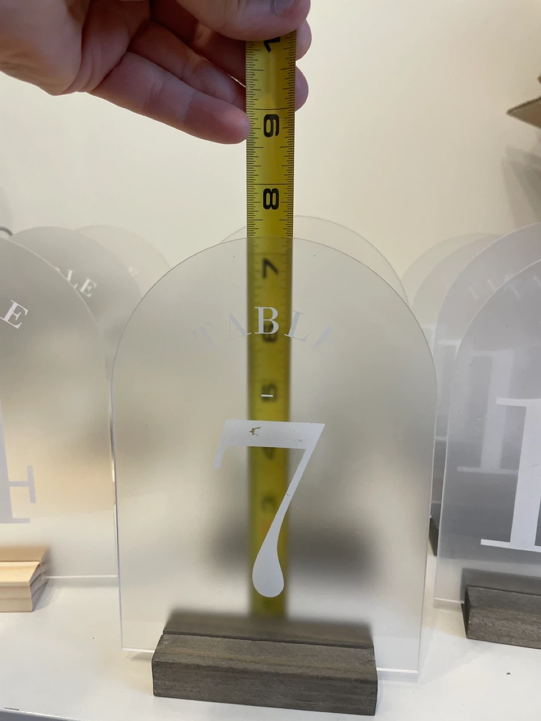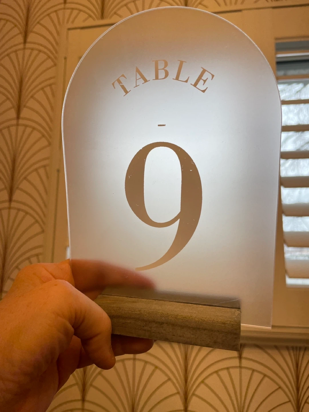 Frosted acrylic arch table numbers, perfect for weddings or events. Each number is 7 inches tall and comes with a wooden base. Includes numbers 1-14. They're a stylish way to guide guests!