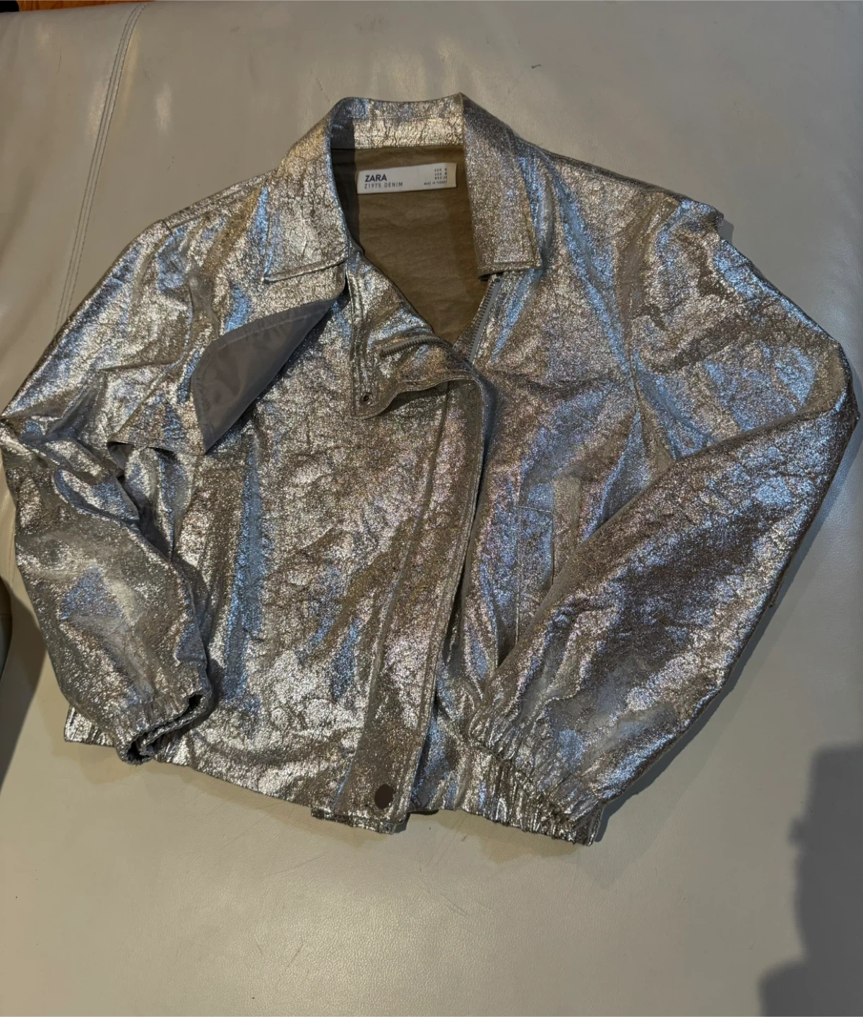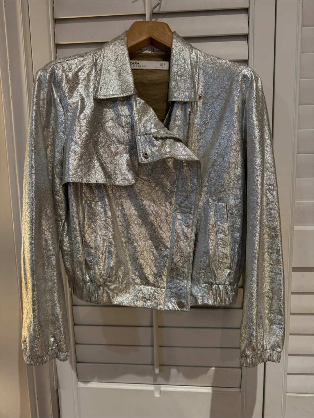 Selling a Zara jacket in a shiny silver colour! It's a size M and in great condition. Perfect for adding a bit of sparkle to your outfit!