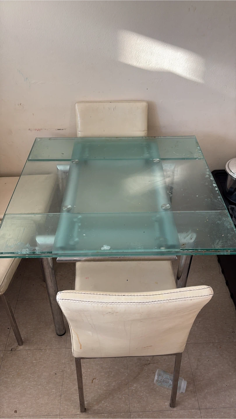 Selling a glass top dining table with four chairs. The chairs are a light cream colour with chrome legs. The table also has chrome legs. Great for a small dining area!