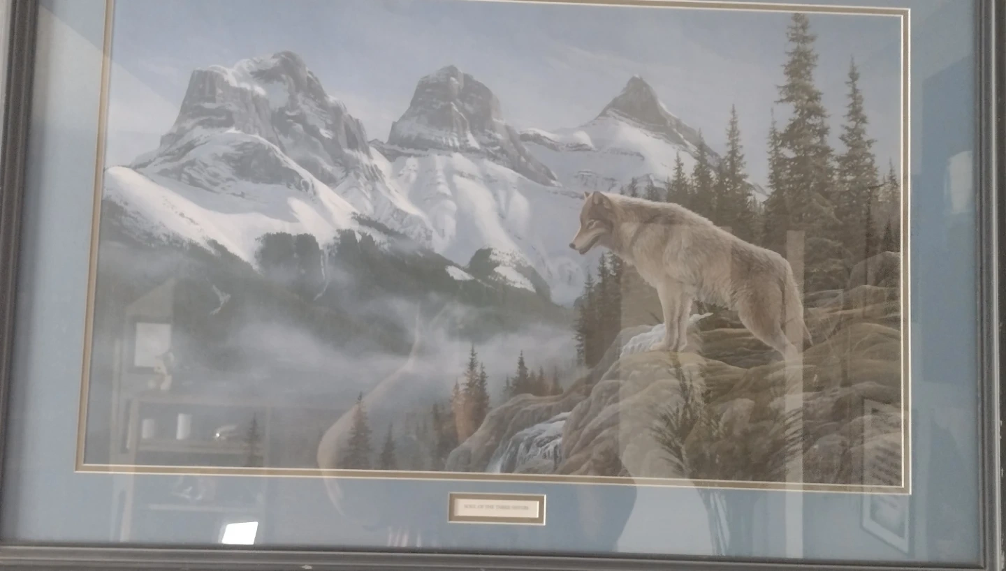 This framed print showcases a wolf with a snowy mountain backdrop. The artwork is titled 'Wolf of the Three Sisters'. It's ready to hang and would complement a nature-themed decor.