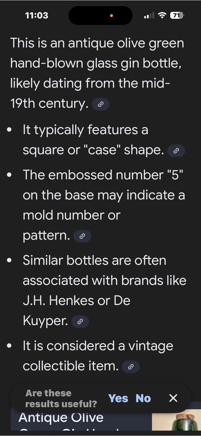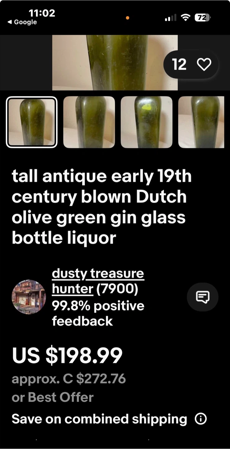 Buy & Sell1800’s Gin Bottle1800’s Gin Bottle$60-1800’s Gin bottle, 10 3/4” tall, antique, olive coloured hand-blown glass -sells for between $150-$200 but can be yours for $60!WHERE TO MEETDemorestvilleView MapSELLERverifiedBillDemorestville600 reviews0 chats·0 favorites·5 viewsSEND CHAT TO SELLERHi Bill! I’m interested in your listing.Hi Bill! I’m interested in your listing.Get the Karrot app to chatSign In to chat