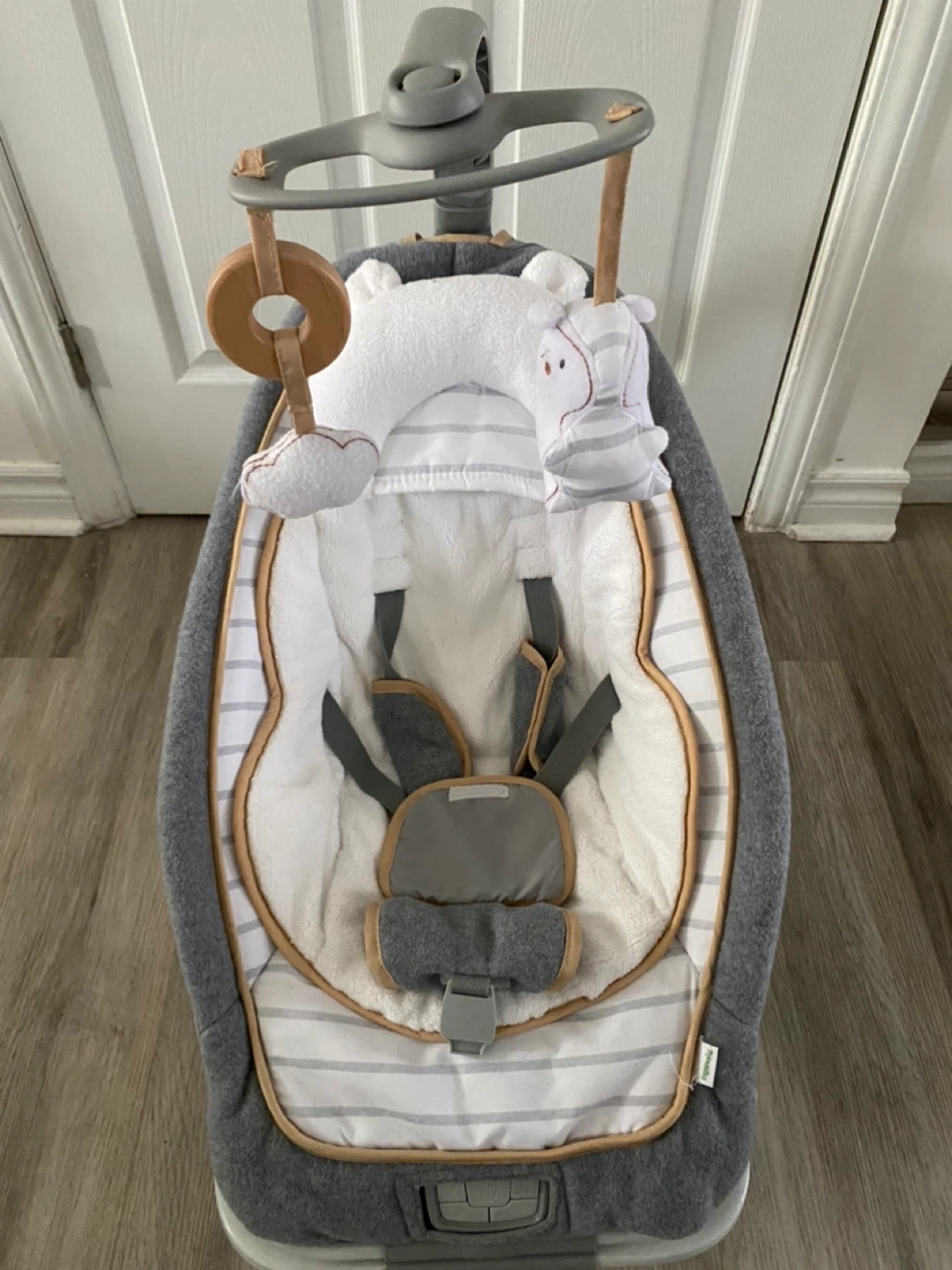This is a soft baby bouncer seat with a grey and white striped pattern. It has an overhead toy bar with plush toys and a secure five-point harness. The seat includes a comfortable head support pillow. It's a cozy spot for little ones to relax and play!