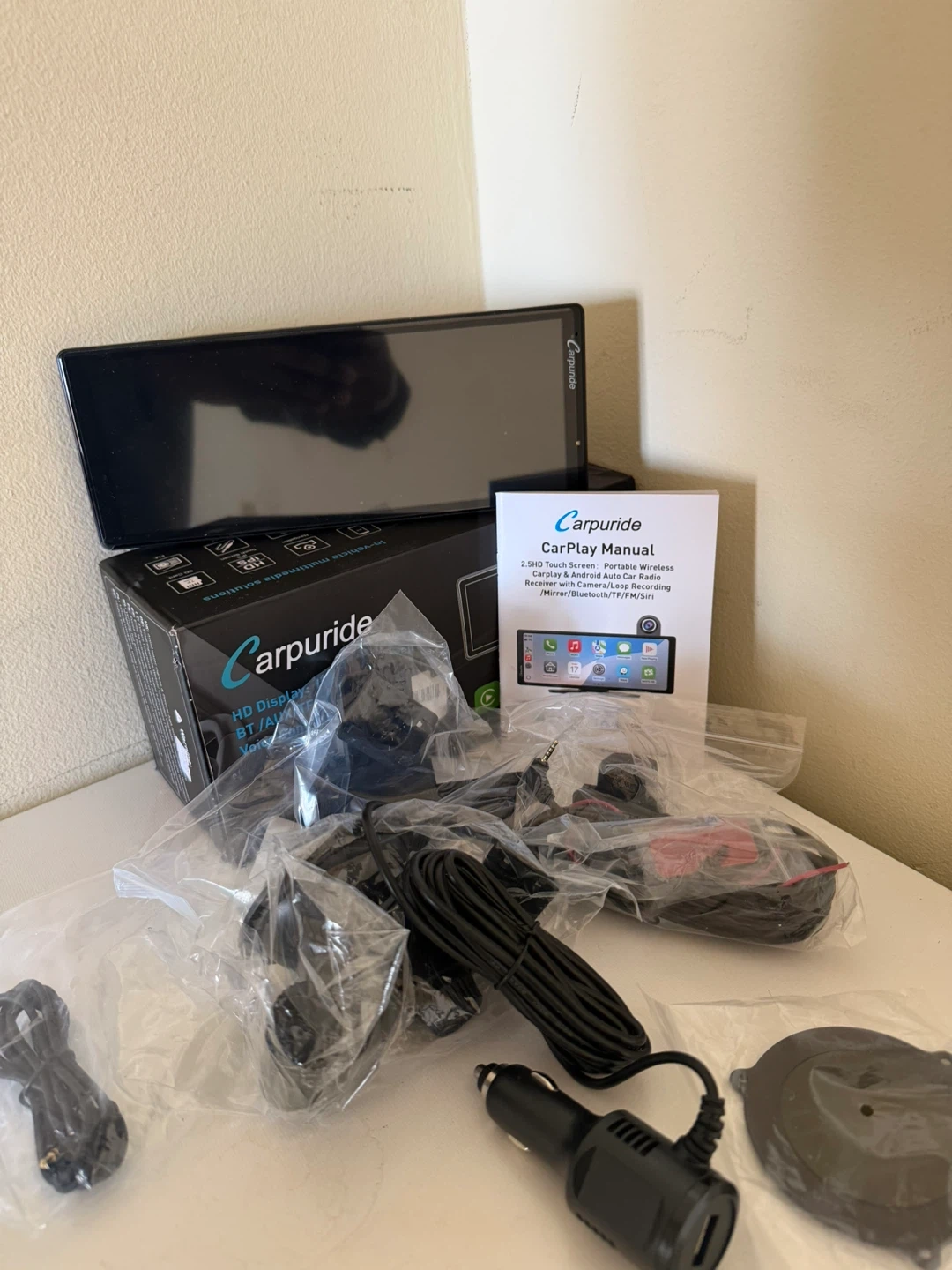 Carpuride 10.2" portable wireless CarPlay system with a HD IPS touch screen. It supports Bluetooth, AUX, TF card, and audio video inputs, along with voice controls. Comes with all cables and the manual for setup. A dashcam is also integrated.