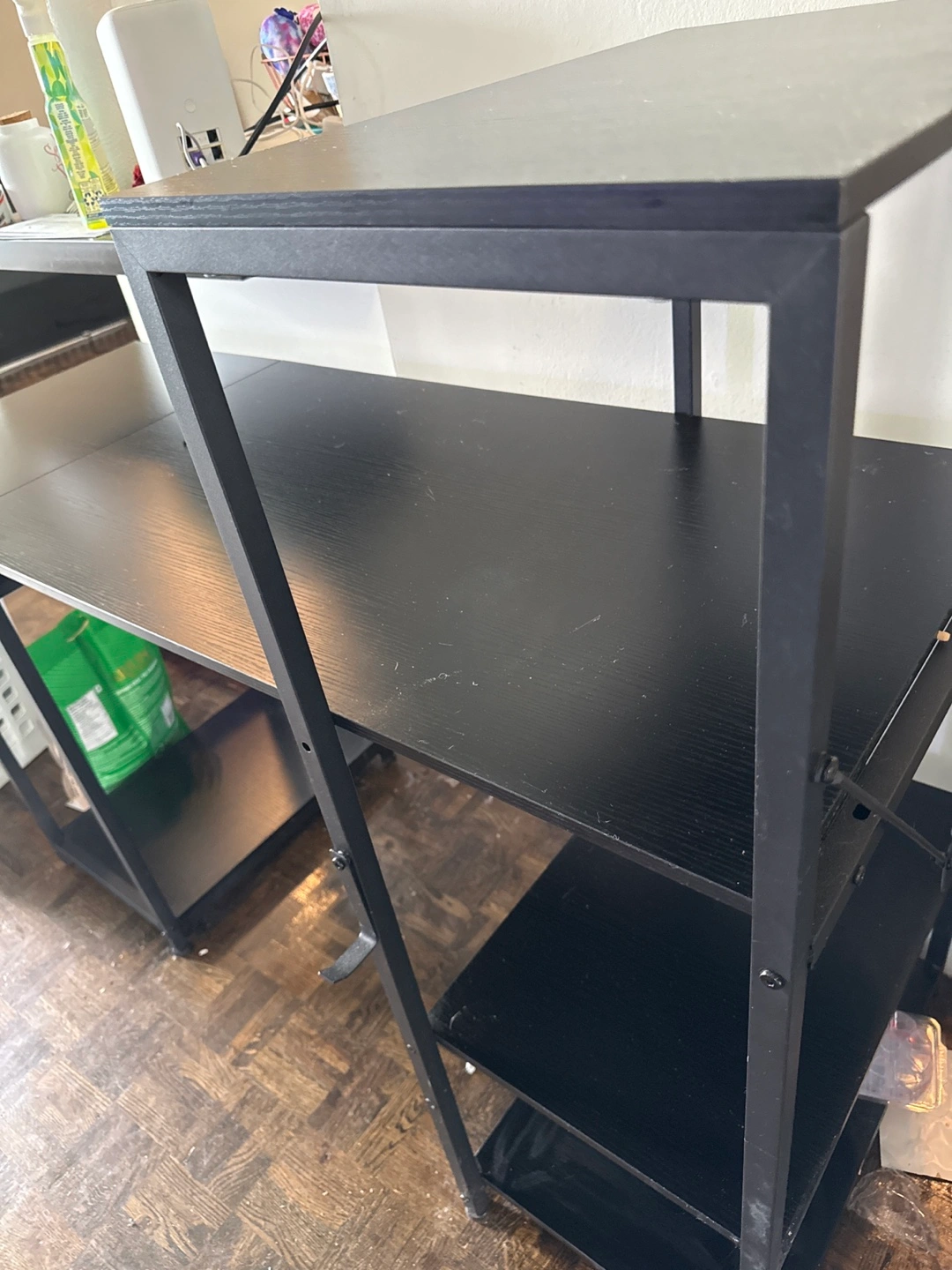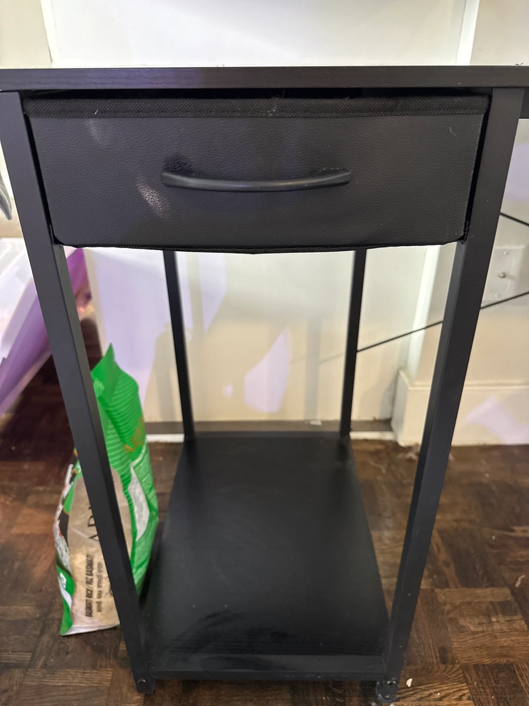 Selling a black desk with a drawer and shelves. It's in good condition and perfect for a home office or study space. The desk has a sleek design and offers ample storage with the drawer and shelving units. It's a great addition to any room!