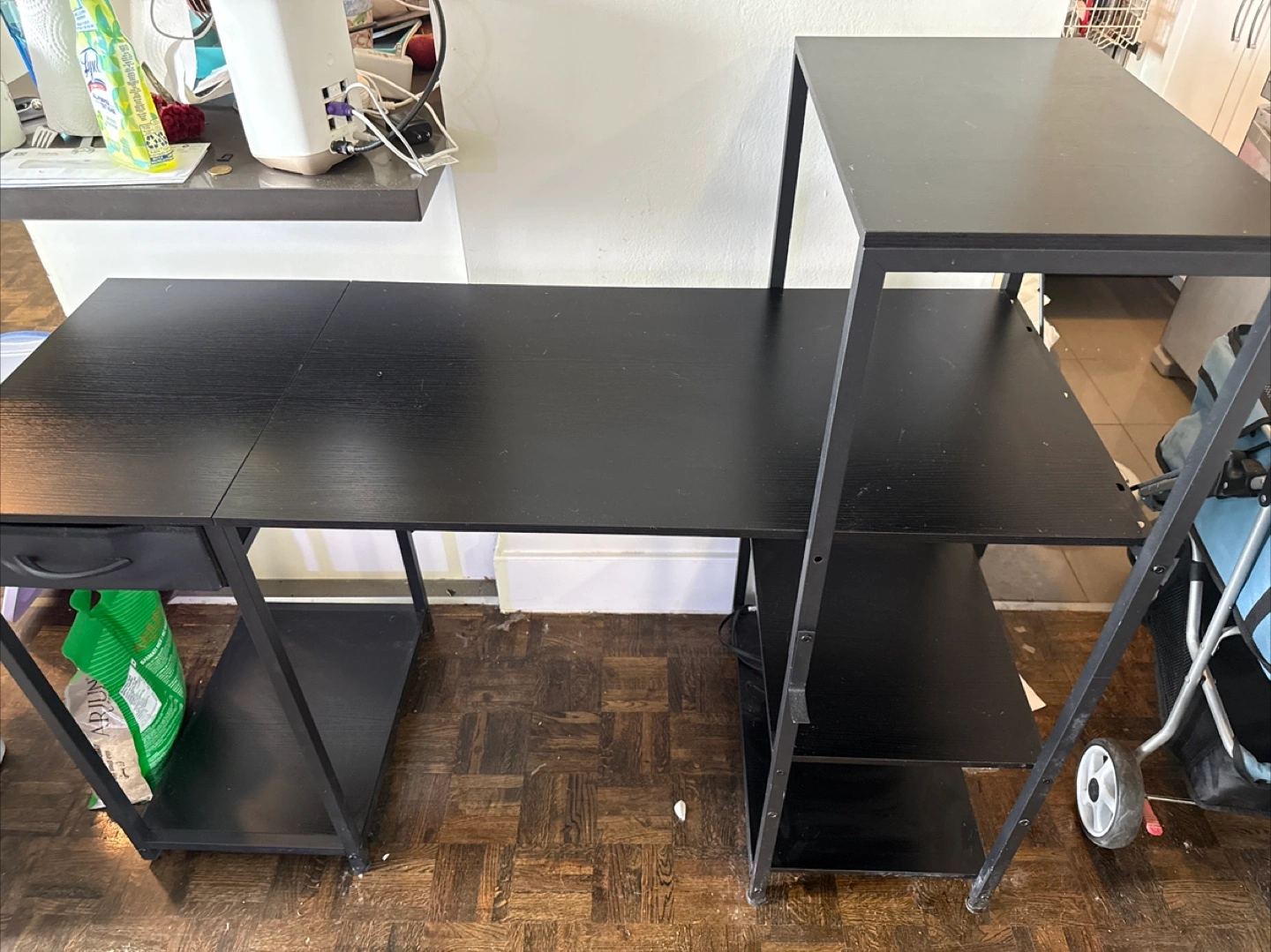 Selling a black desk with a drawer and shelves. It's in good condition and perfect for a home office or study space. The desk has a sleek design and offers ample storage with the drawer and shelving units. It's a great addition to any room!