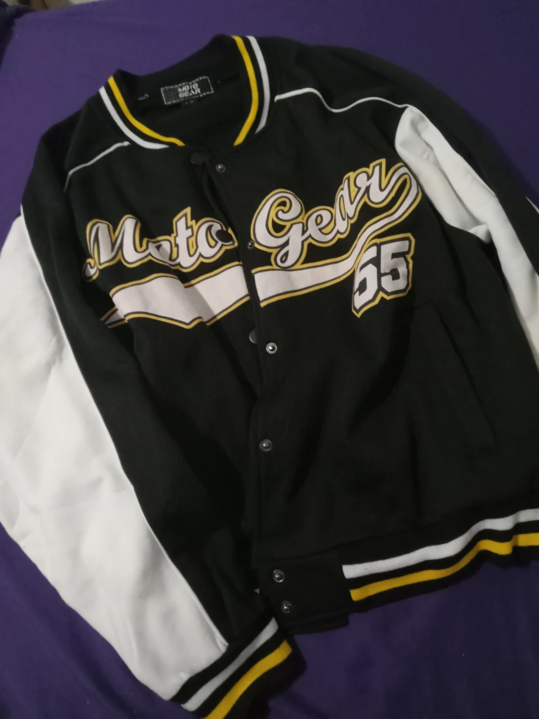 Trendy Black Moto Gear varsity jacket. It has snap button closures and striped cuffs and collar. Features "Moto Gear 55" graphic on the front. Men or women could wear it. Brand new never worn before