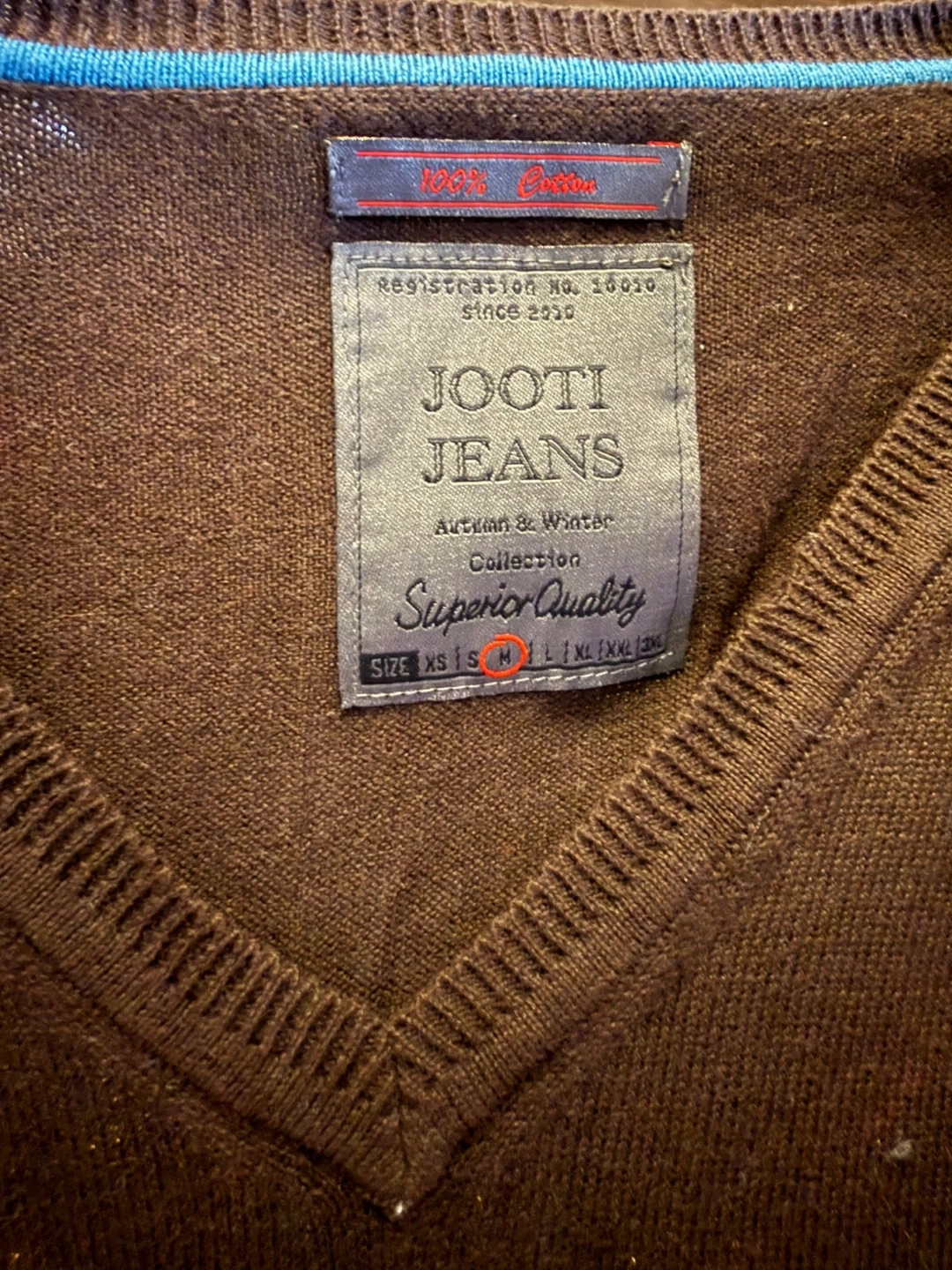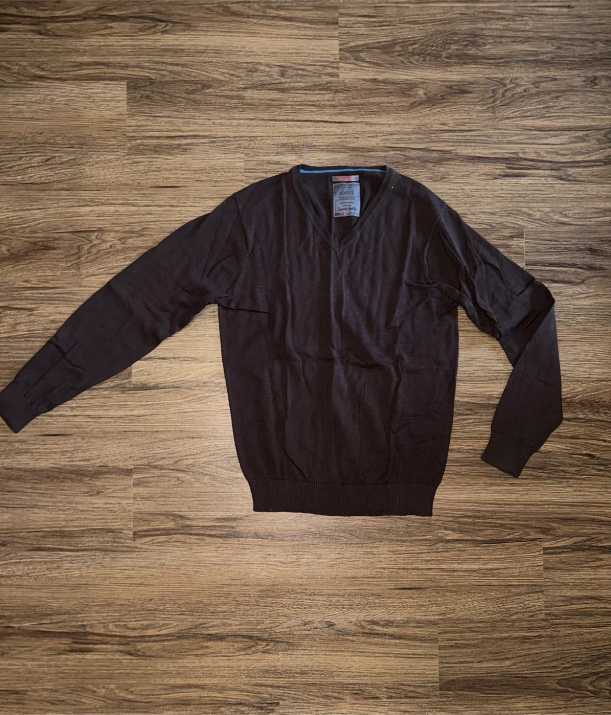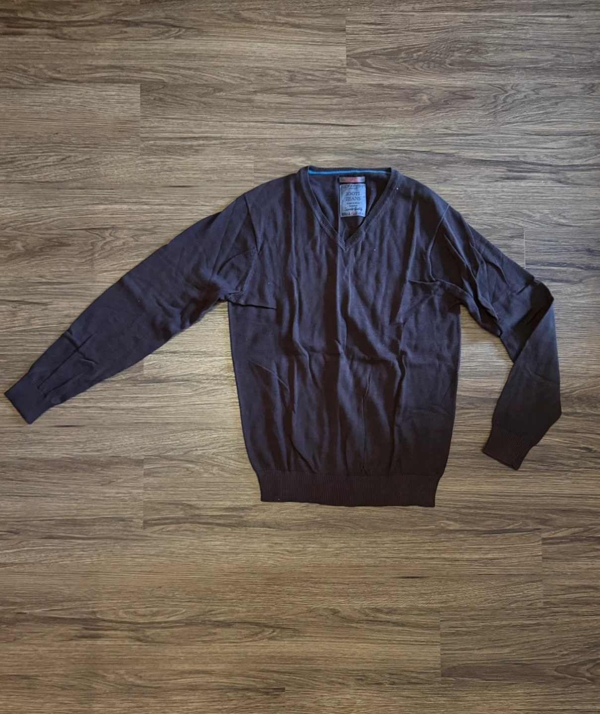 JOOTI JEANS V-neck sweater in a dark brown colour. This is a men's size medium. Made with 100% cotton for comfort.