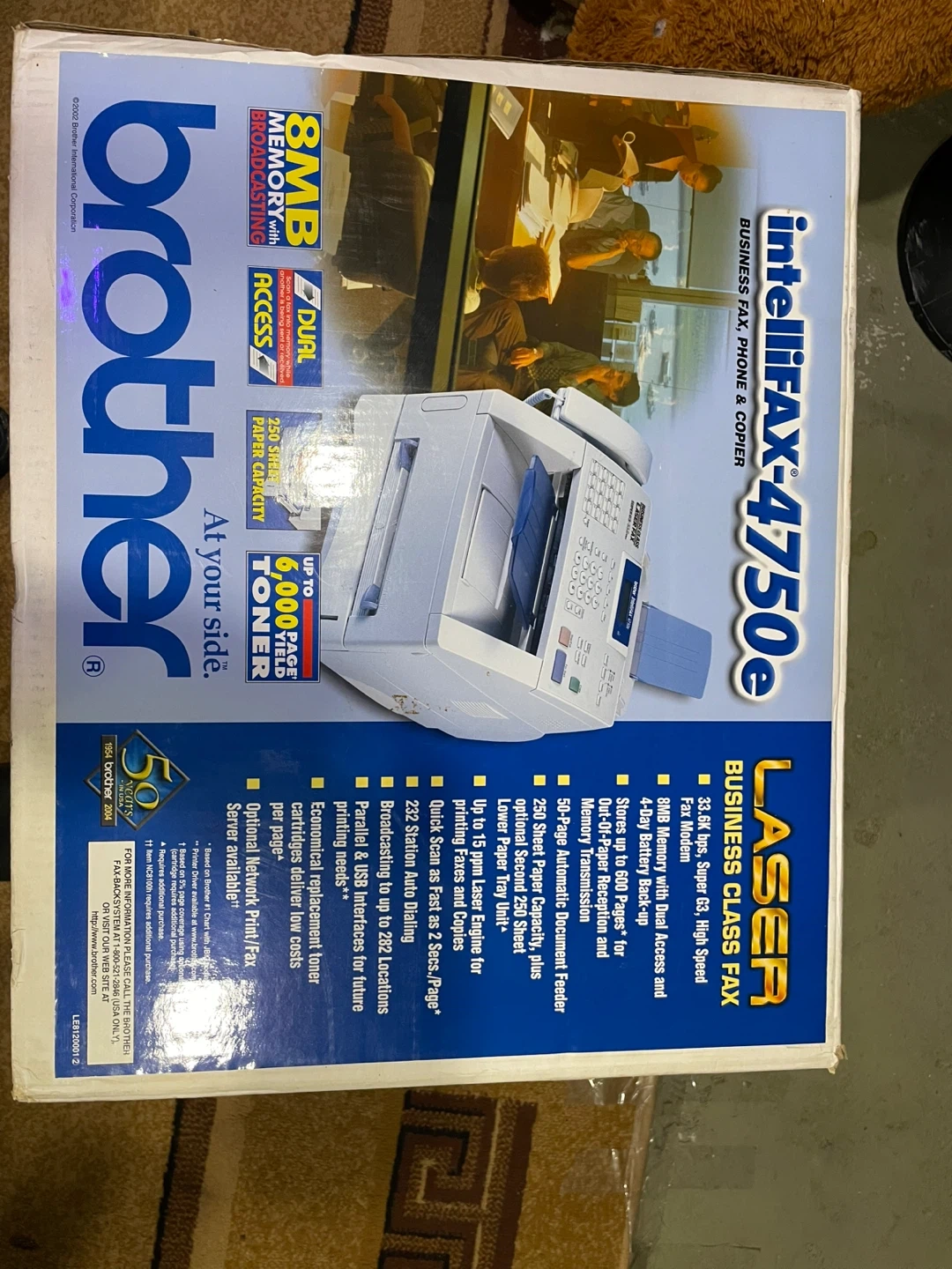 This is a Brother Intellifax-4750e Laser Business Class Fax, Phone & Copier. It has 8MB memory with dual access and 4-way battery back-up. Features up to 6,000 pages toner capacity and 250-sheet paper tray. This machine is great for busy offices needing reliable communication and copying!