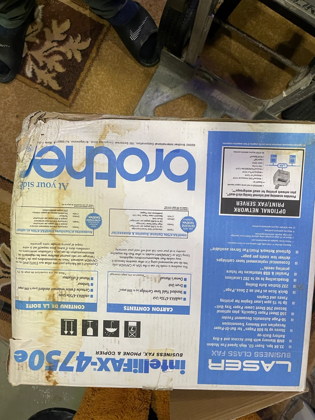 This is a Brother Intellifax-4750e Laser Business Class Fax, Phone & Copier. It has 8MB memory with dual access and 4-way battery back-up. Features up to 6,000 pages toner capacity and 250-sheet paper tray. This machine is great for busy offices needing reliable communication and copying!
