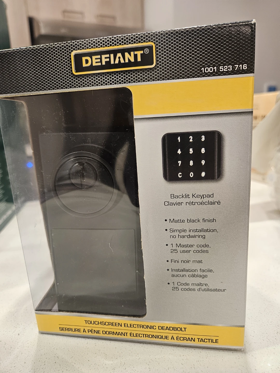 Selling a brand new (box was opened) Defiant Touchscreen Electronic Deadbolt! It features a backlit keypad and a matte black finish. It also offers simple installation with no hardwiring. It has 1 master code and 25 user codes. It also has an auto-lock feature with adjustable delay (10-99 seconds).