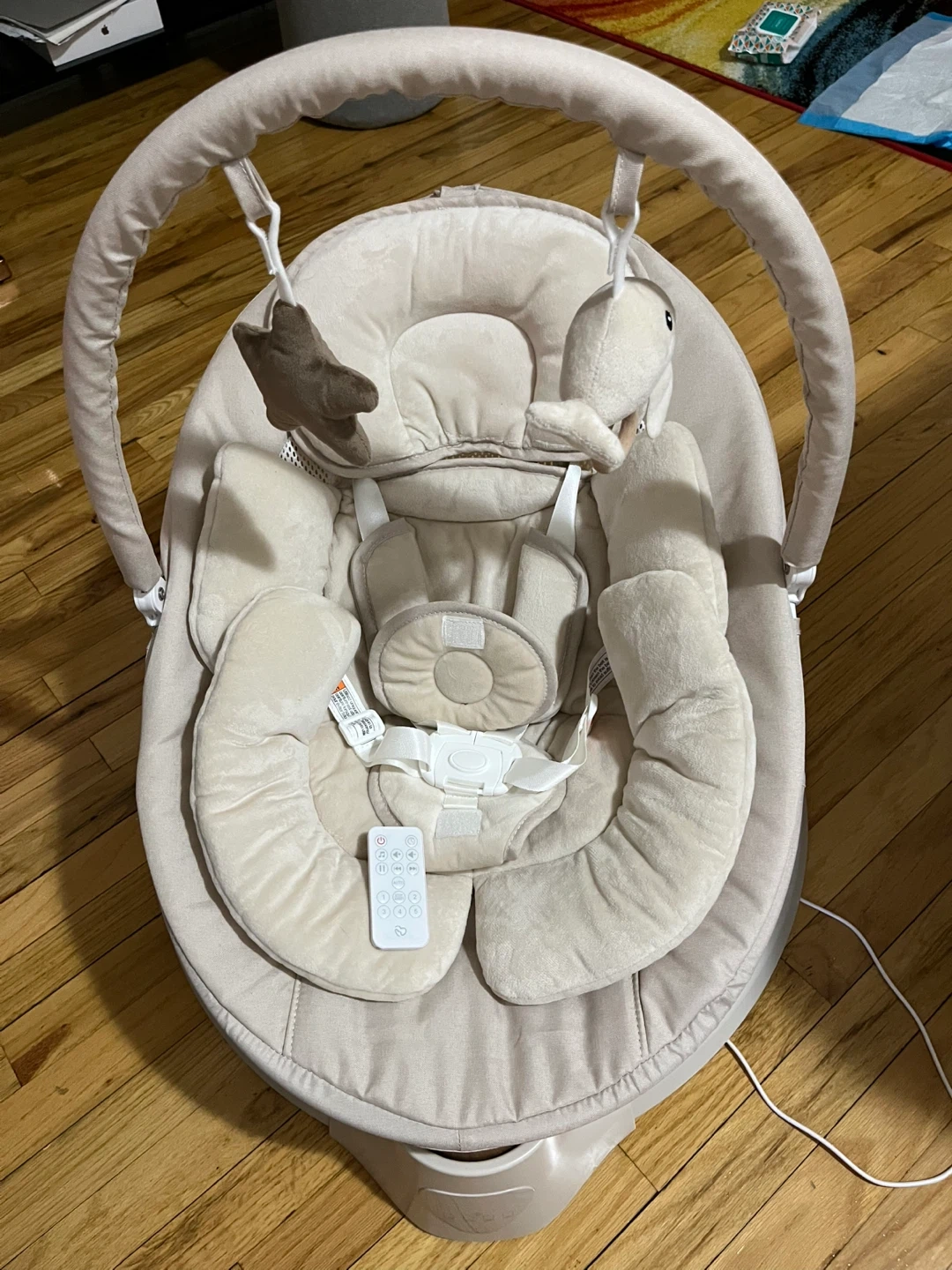 Neutral colored baby swing with plush padding. 10 melodies, 5 speeds. It's designed for infant comfort and includes a remote control for various settings. Soft toys hang from the overhead bar. It's a soothing solution for little ones.