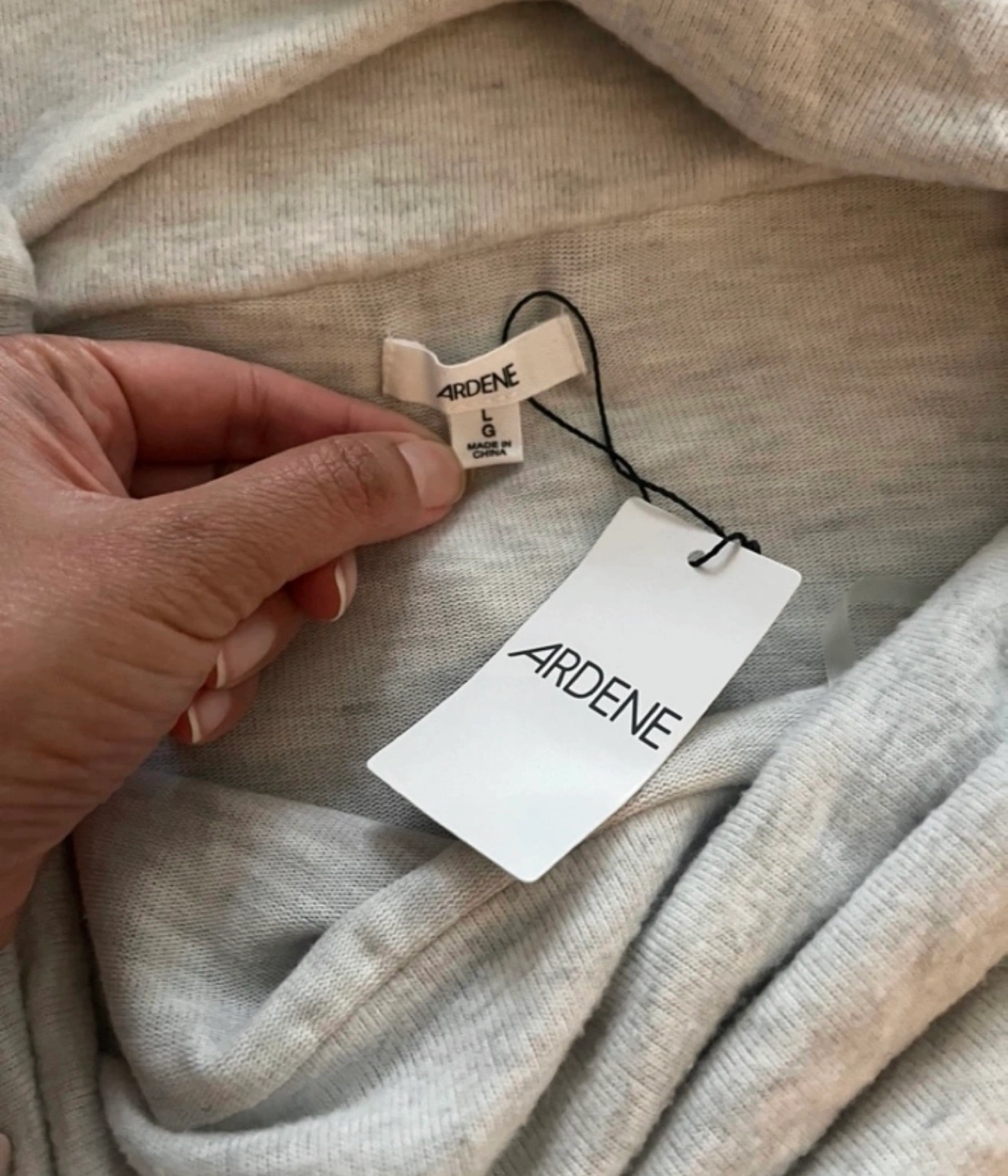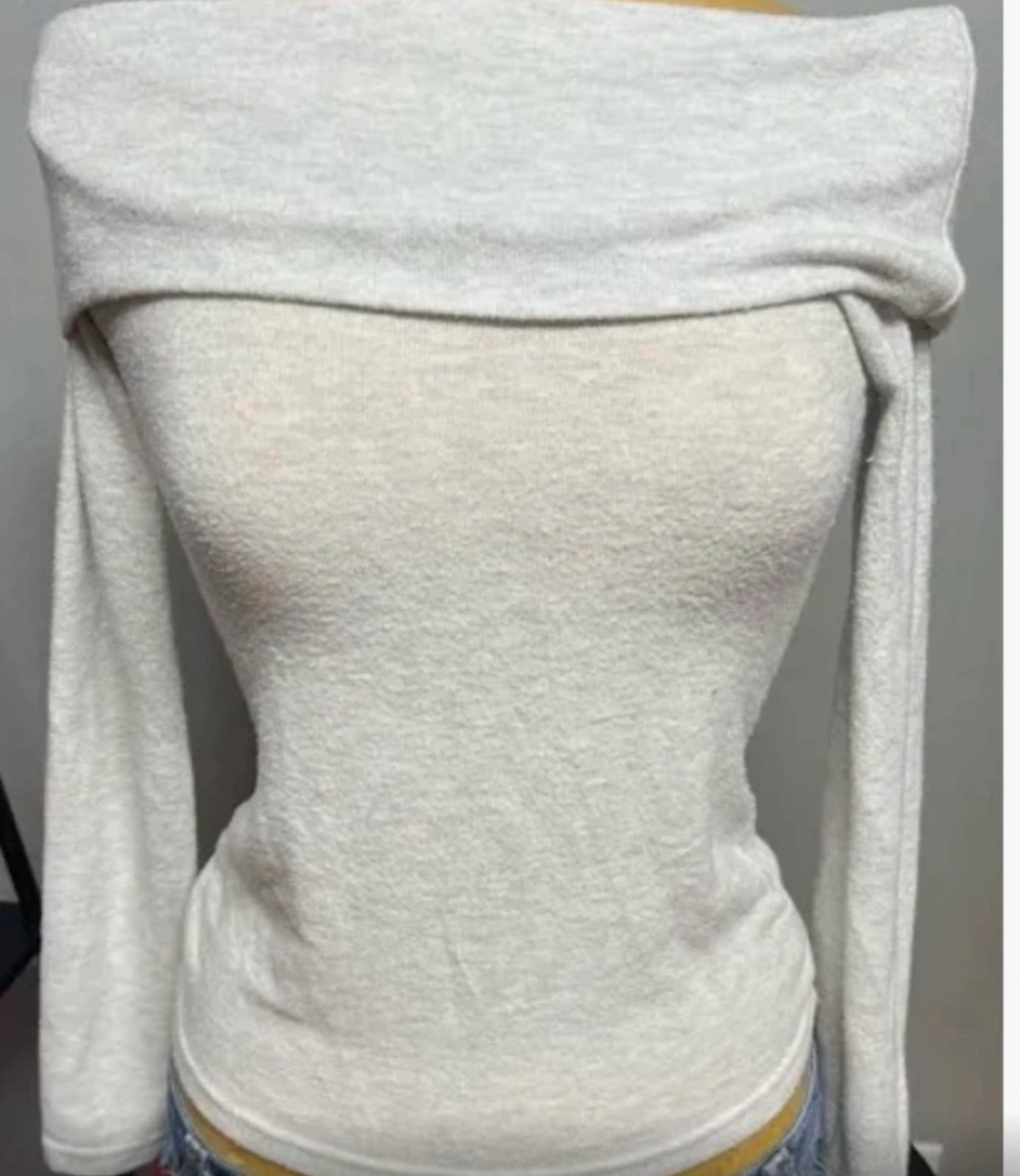 Lightweight grey sweater. Off-the-shoulder neckline. Long sleeves. Size large.