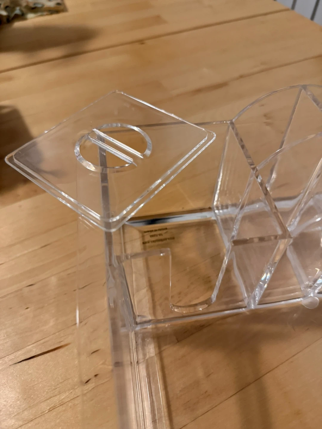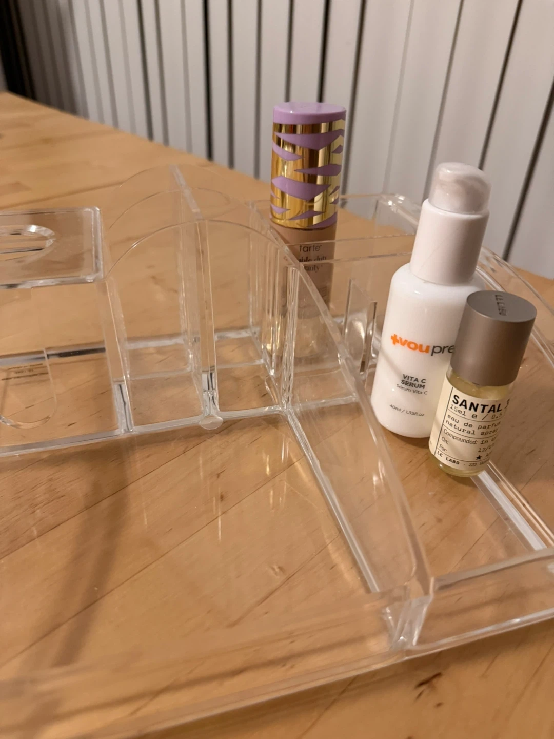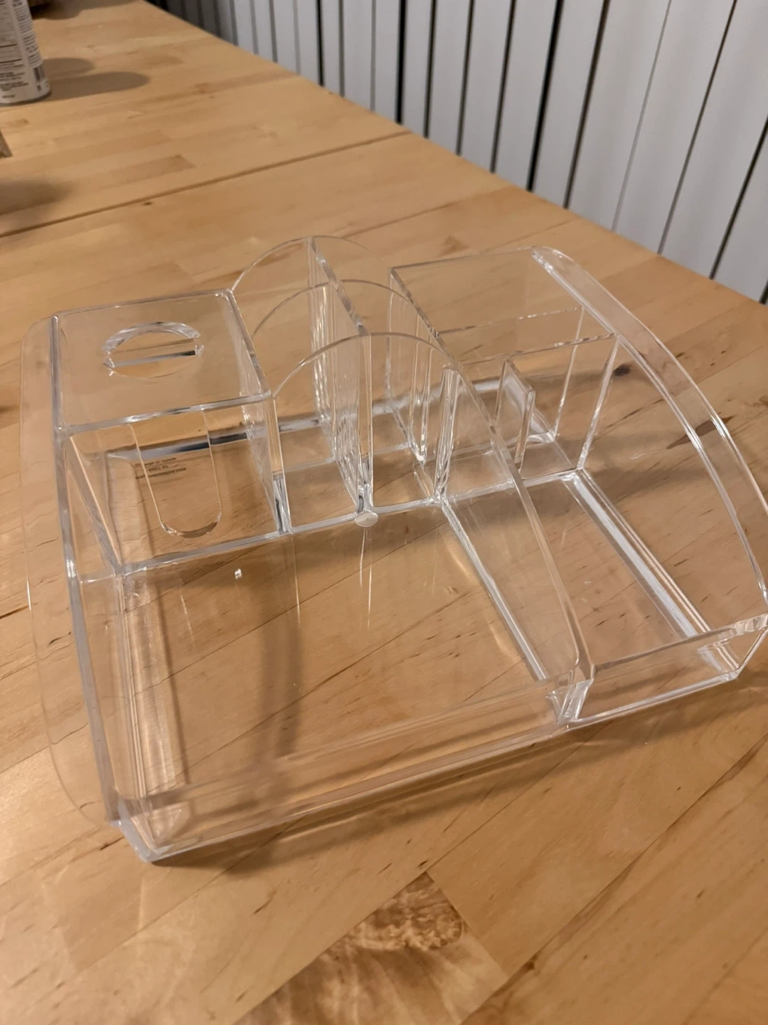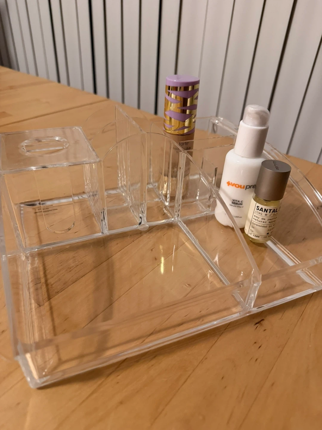 Keep your makeup and cosmetics neatly organized with this high quality acrylic tray. It features multiple compartments of various sizes to hold different items like brushes, lipsticks, and bottles. Great for tidying up your vanity or bathroom counter!