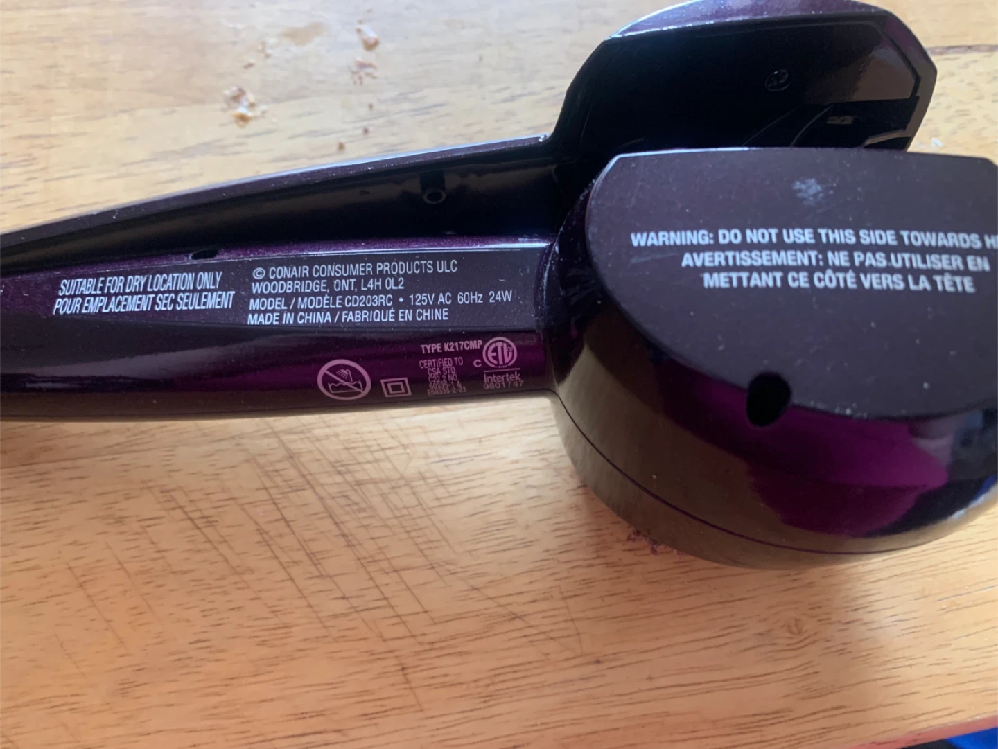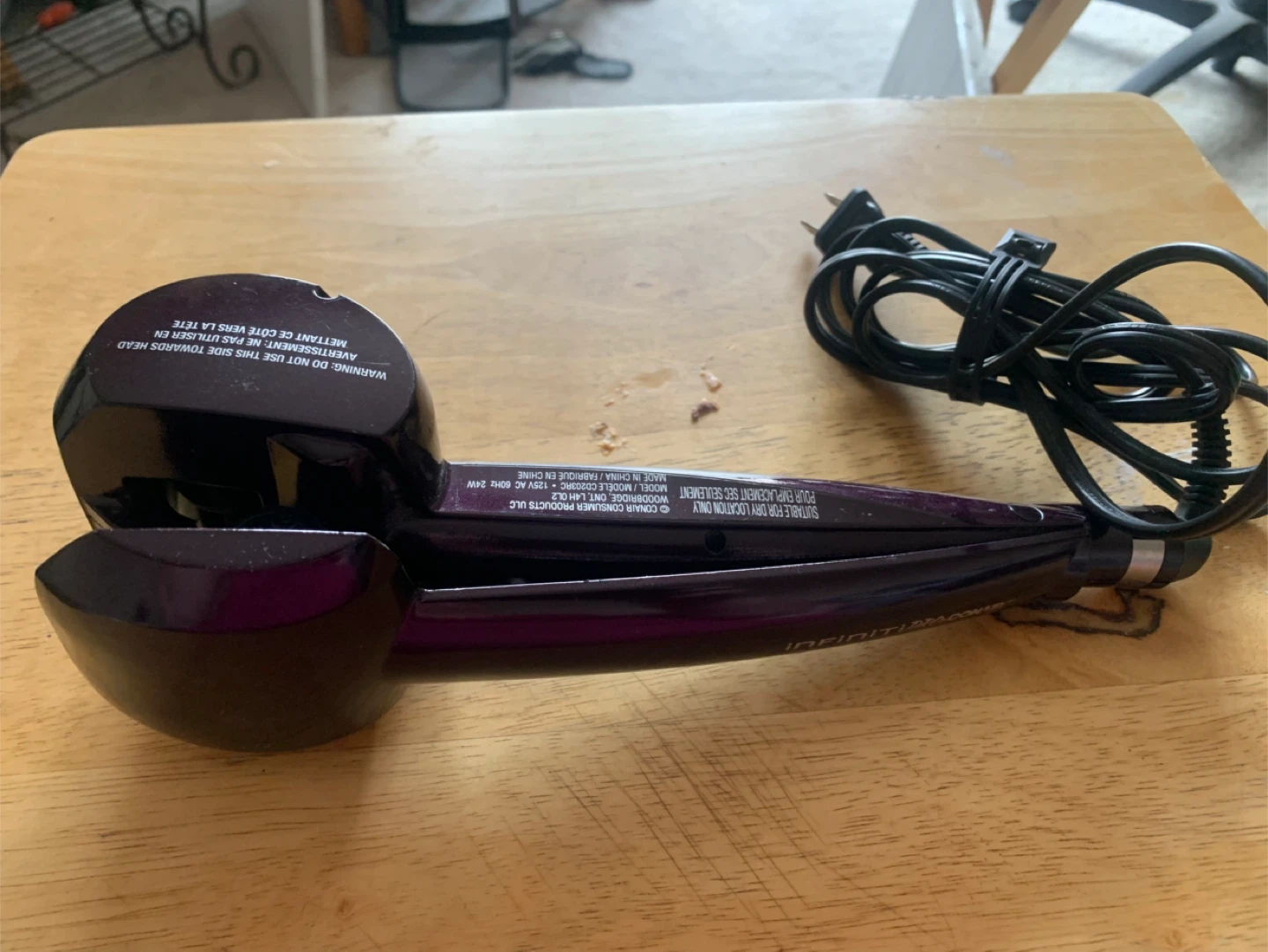 This is the Conair InfinitiPRO Curl Secret automatic curler. It's designed for dry location use only.