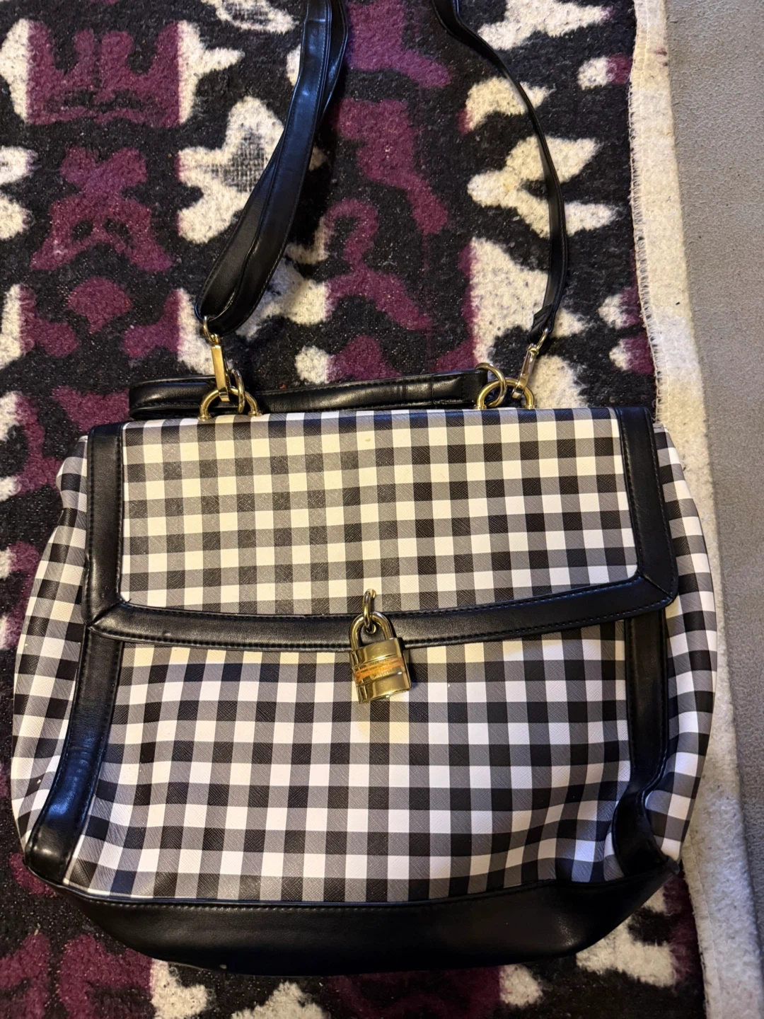 This satchel bag features a classic black and white gingham pattern. It has a secure lock closure on the front flap. The interior has a 'Signature' brand tag.
