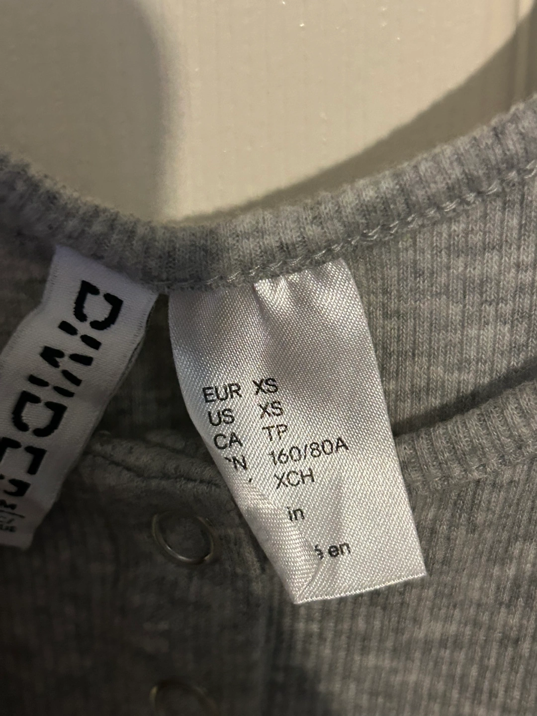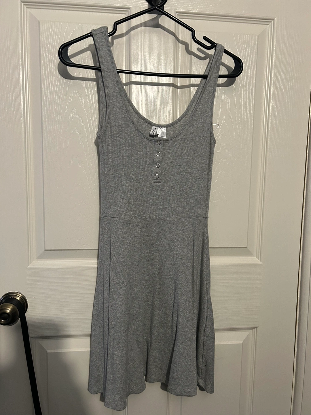 Cute grey mini dress. Ribbed knit fabric. Button detailing at neckline. Size XS. Brand new