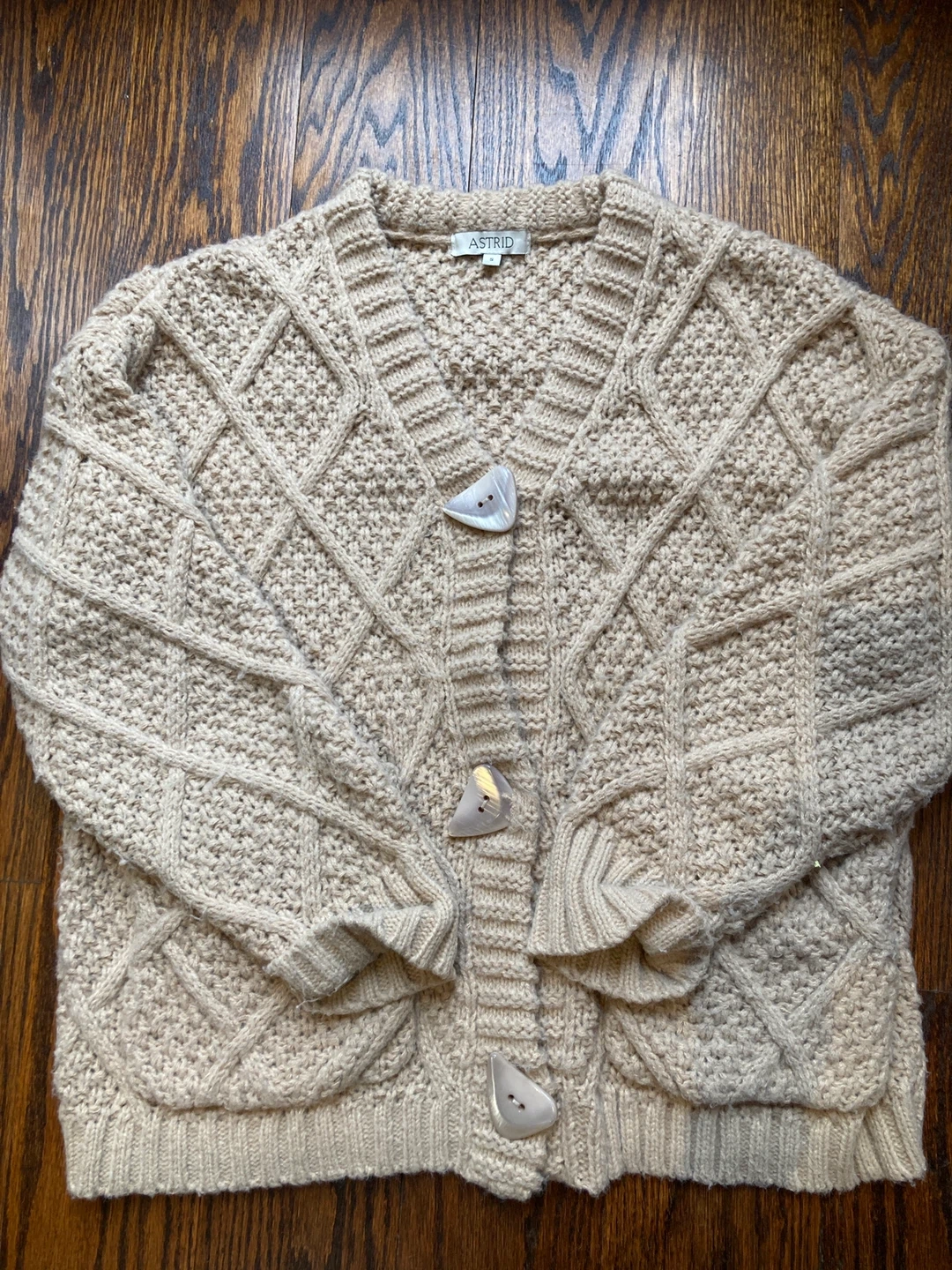 - Astrid beige cardigan, size small oversized fit with statement buttons
