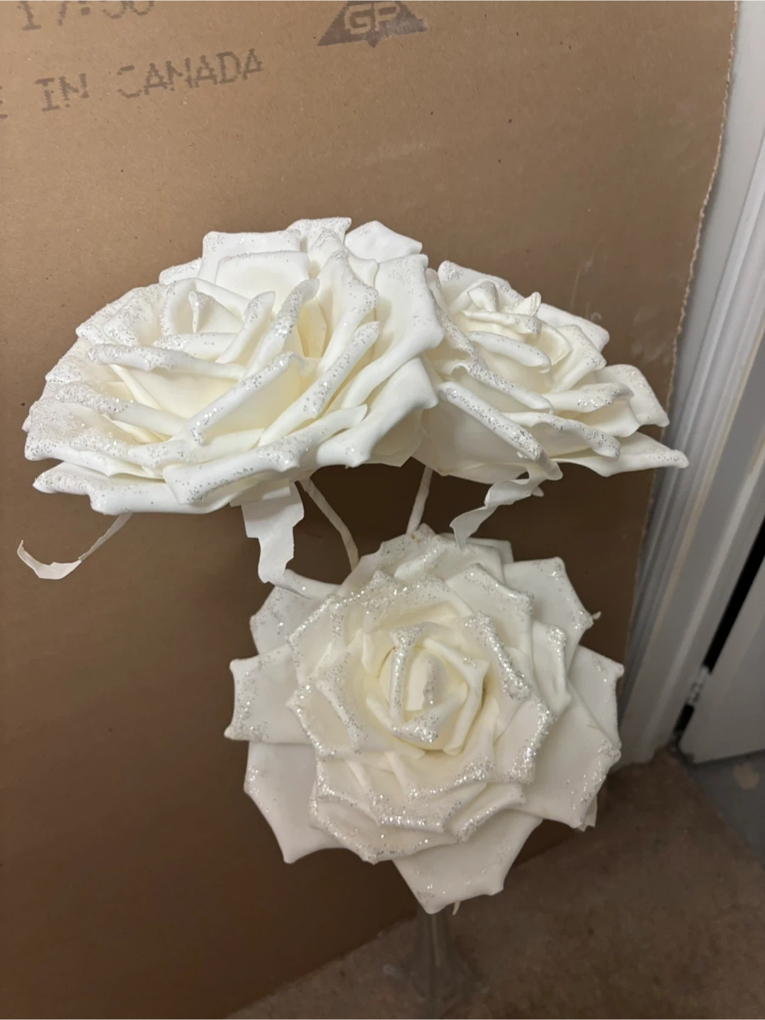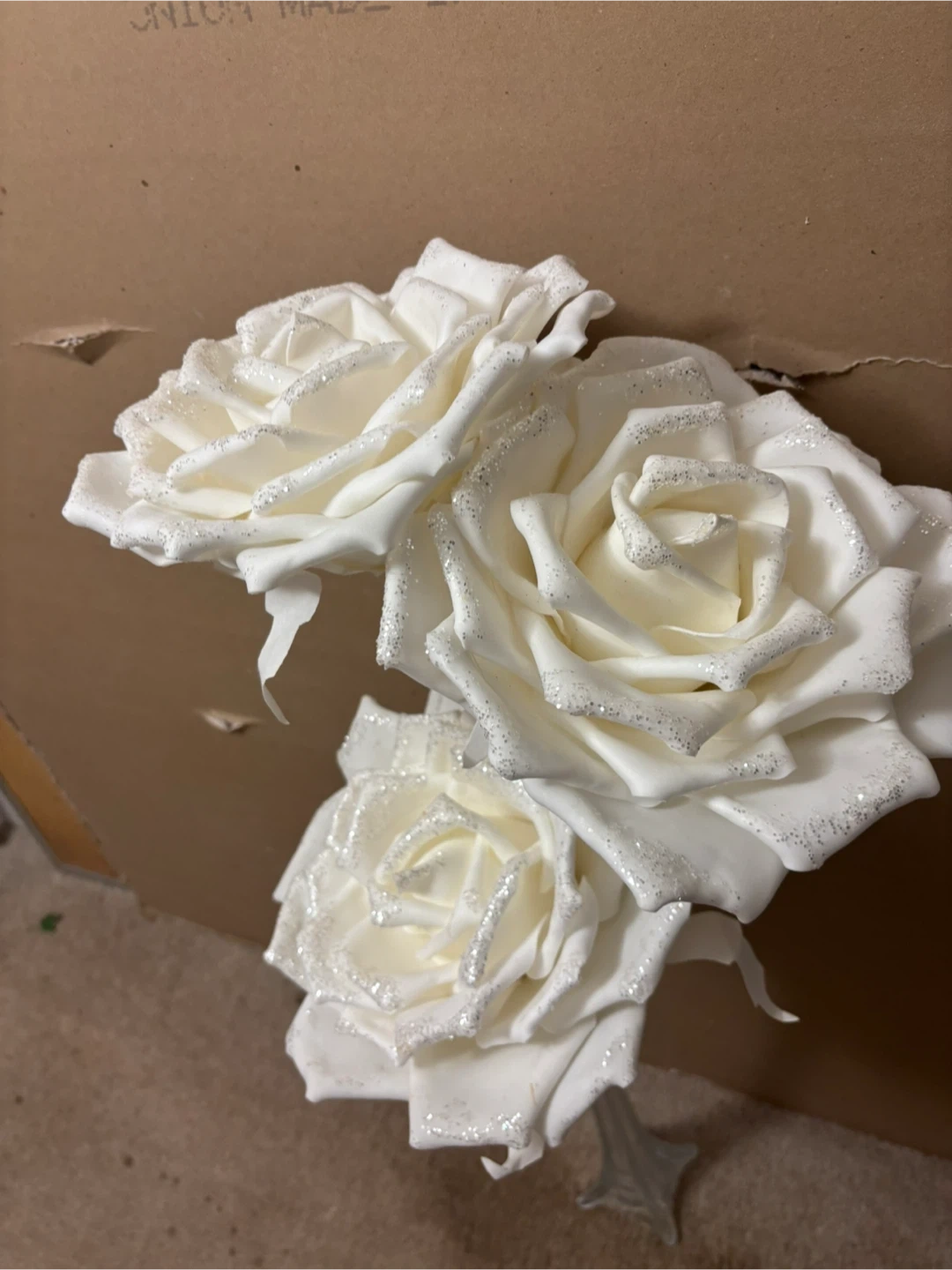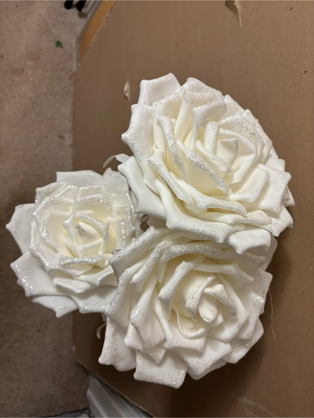 3 White foam Roses with Glitter