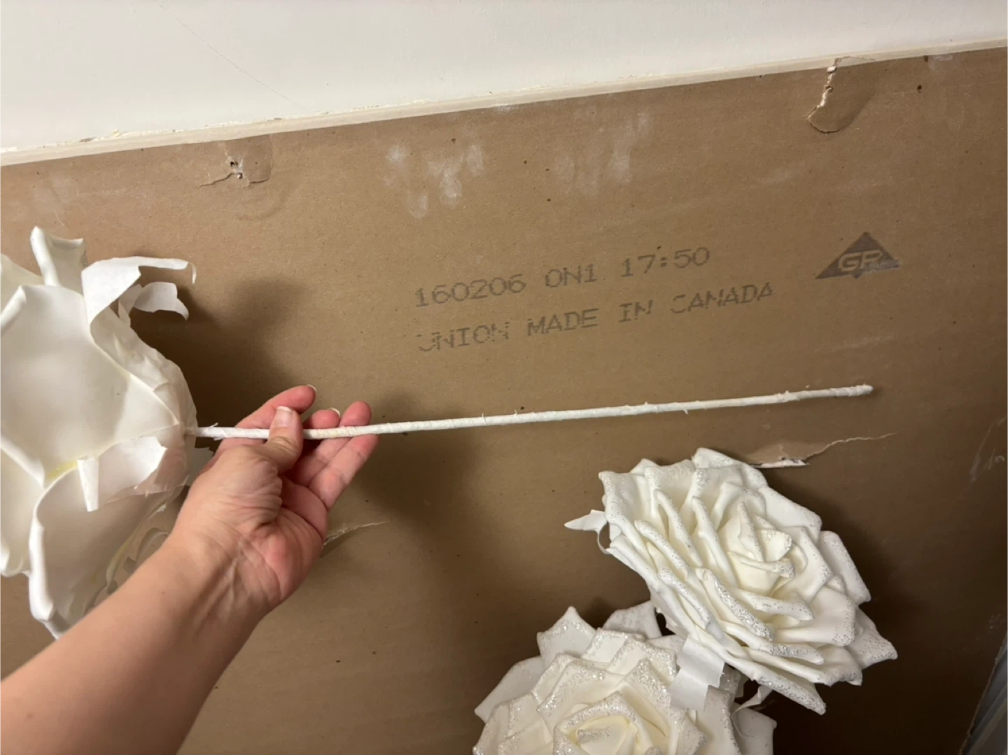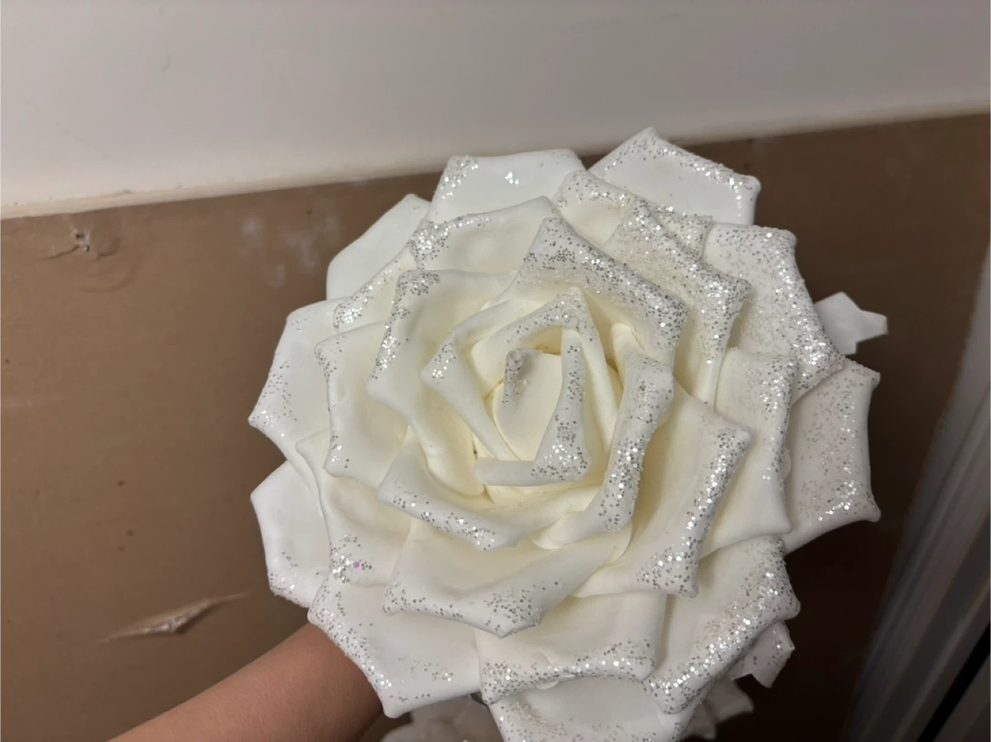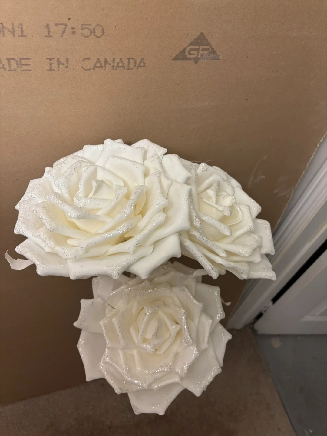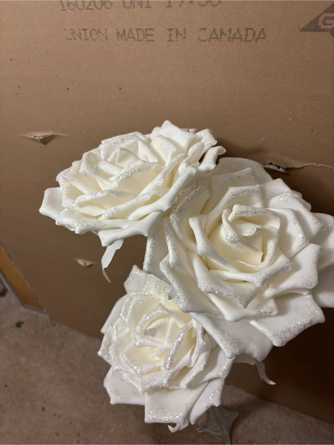 3 White foam Roses with Glitter