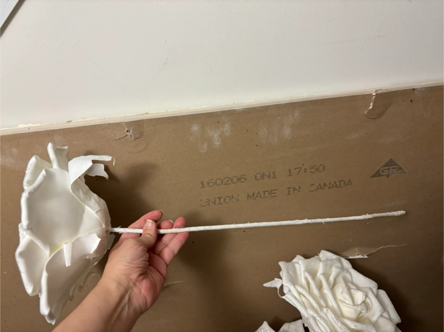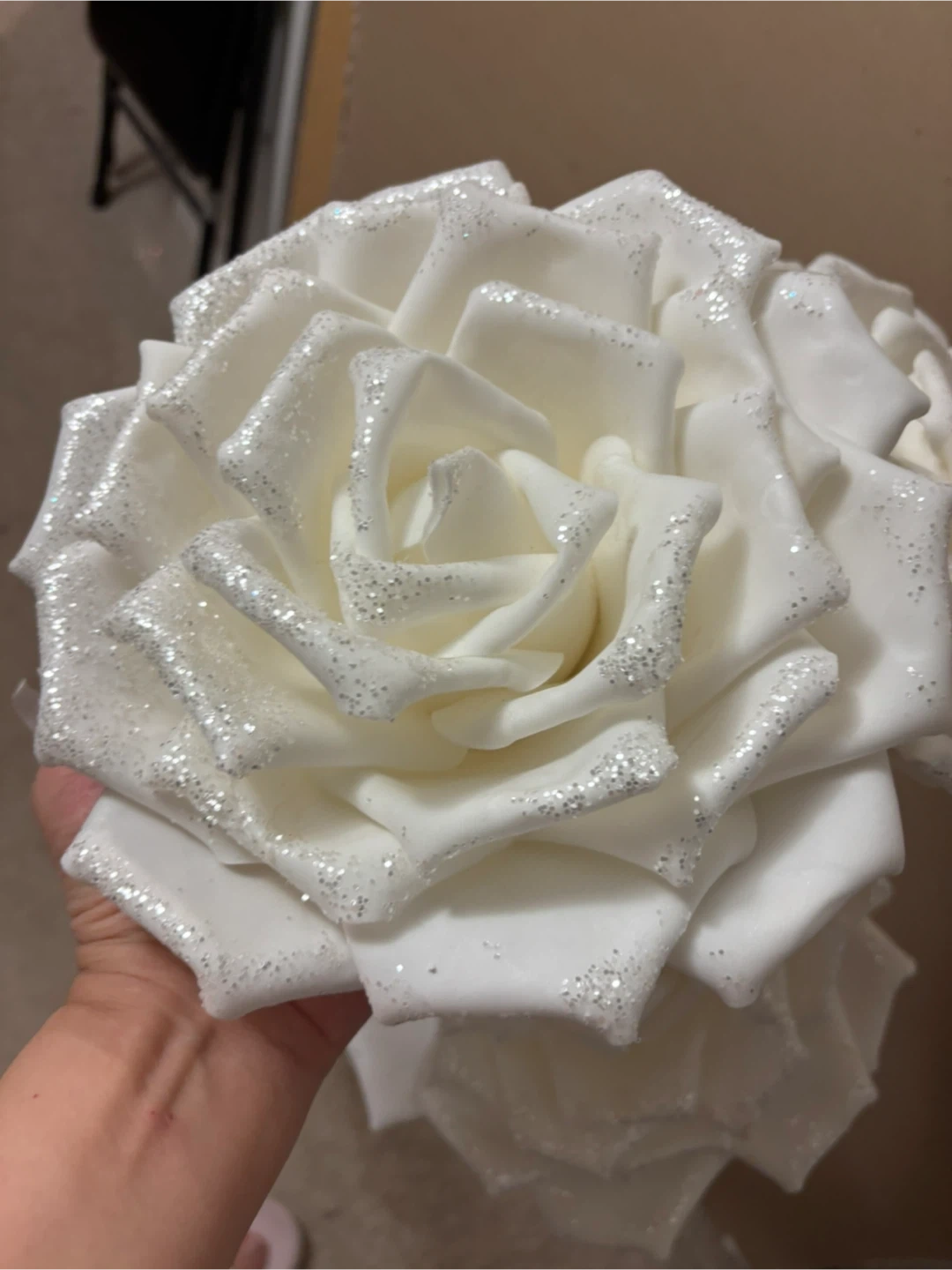 3 White foam Roses with Glitter
