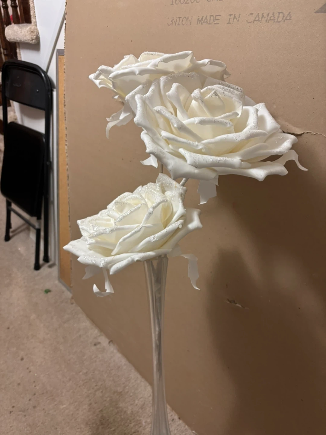 These beautiful artificial roses are perfect for adding a touch of elegance to any space! They are white with a subtle glitter finish with long stem.