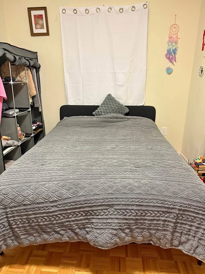 Queen size bed frame for sale. Bought less than a year ago for $179 before tax. Selling for $120. If you need the fluffy blanket and cushion, I can do it all for $180. The original price for the blanket was $89.99 before tax and the cushion was $10. I can give you the mattress for free if you want it. Pick up only!