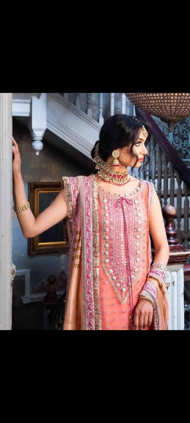 This traditional Pakistani suit features intricate embroidery and beadwork in shades of pink and peach. It includes a kameez, matching trousers, and a dupatta. Perfect for festive occasions or formal events!